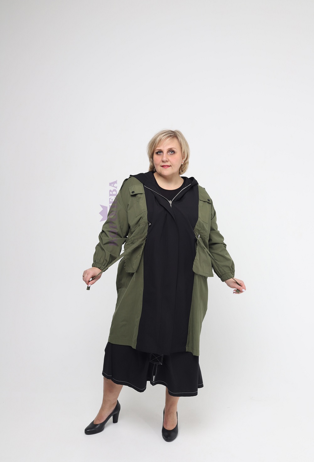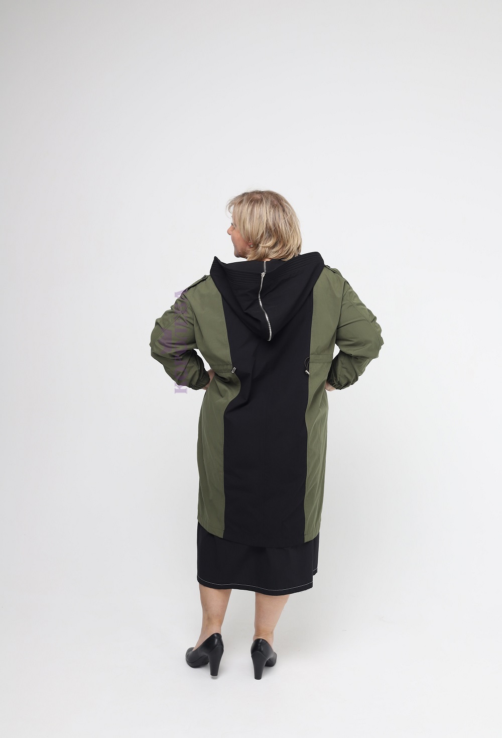 Стильная длинная куртка болотного цвета с черными вставками и капюшоном на молнии с поясом