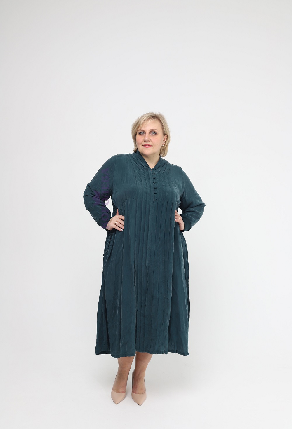 Элегантное синее длинное свободное платье с высоким вырезом горловины и пуговицами
