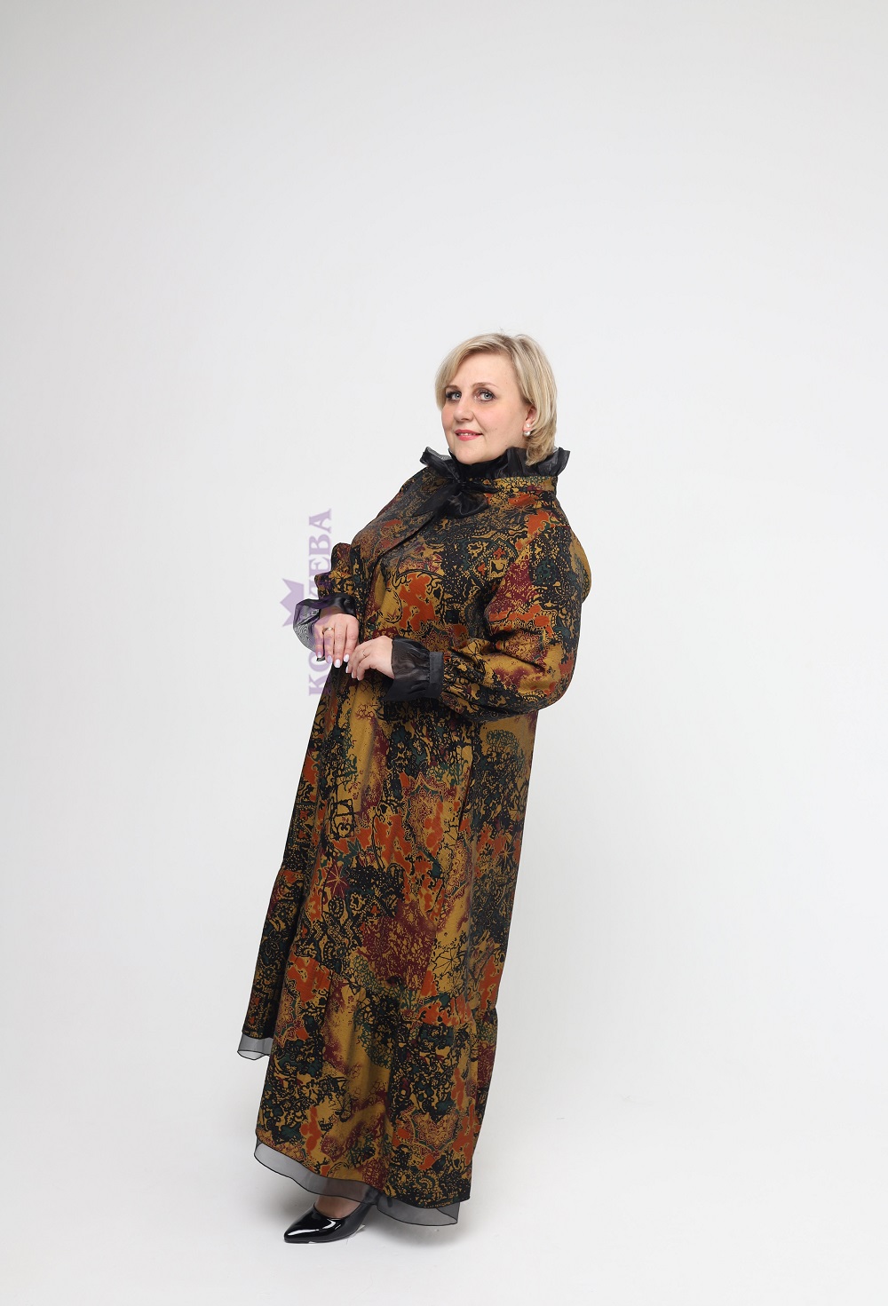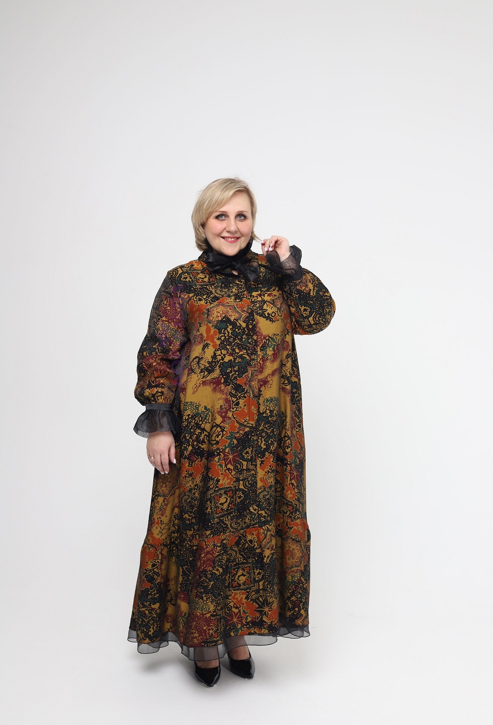 Шикарное золотистое платье с завивающимися узорами до пят с черными манжетами и бантом на воротнике