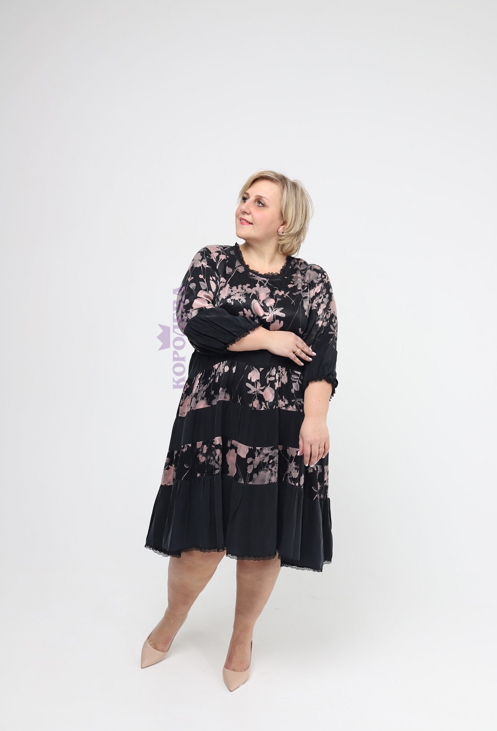 Элегантное свободное черное платье до колен с изображением цветов и круглым вырезом