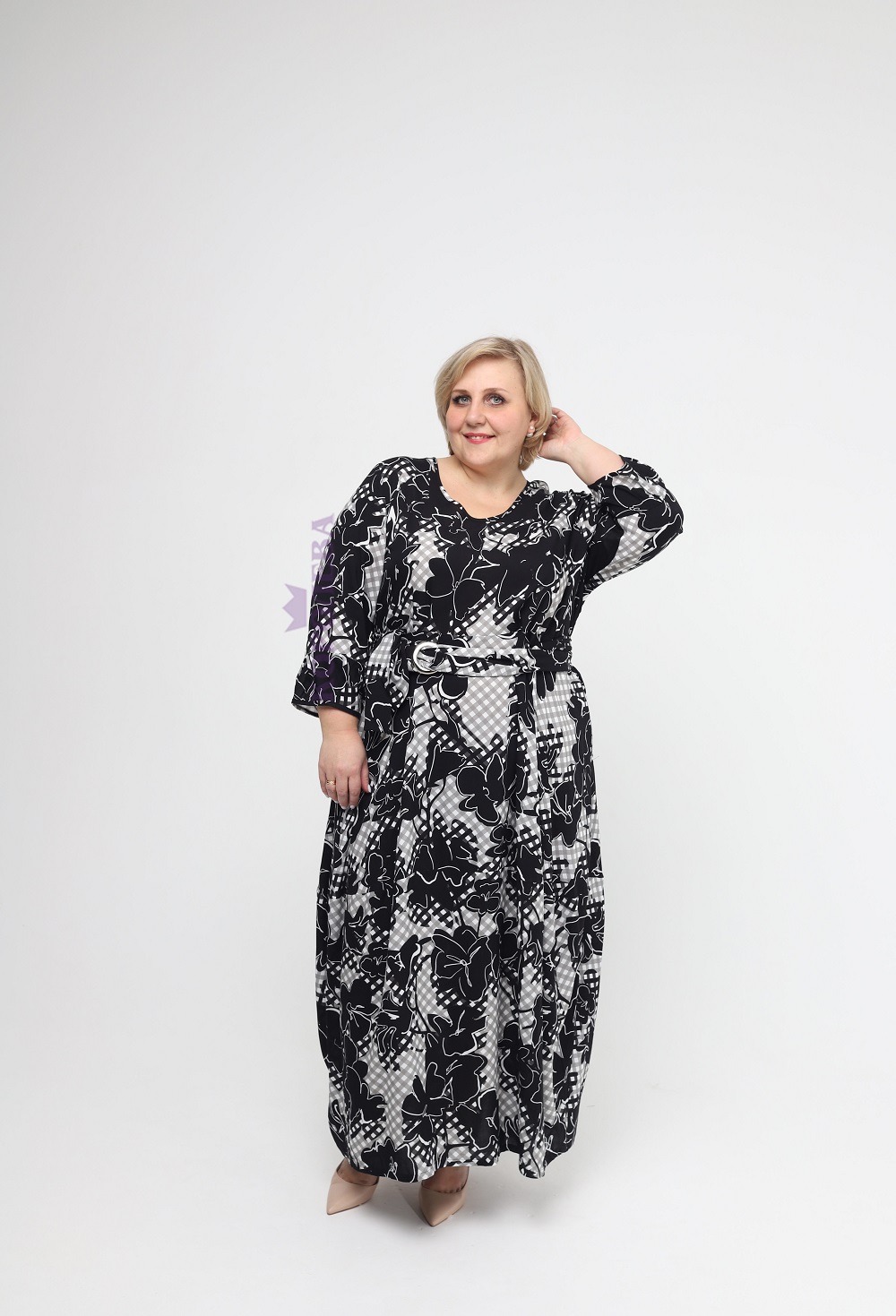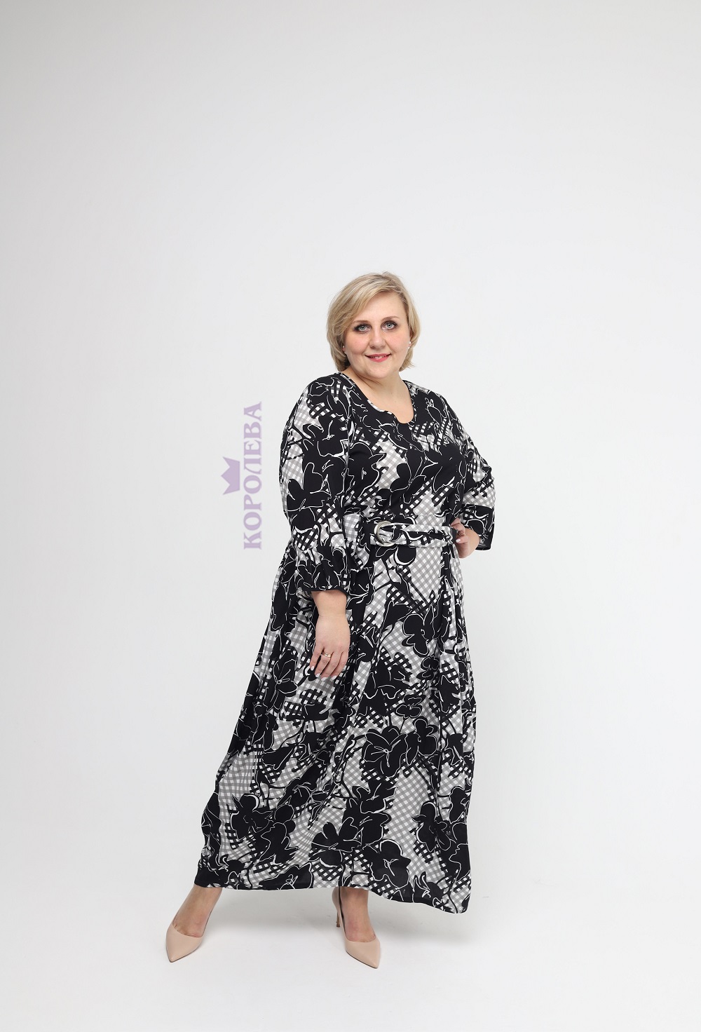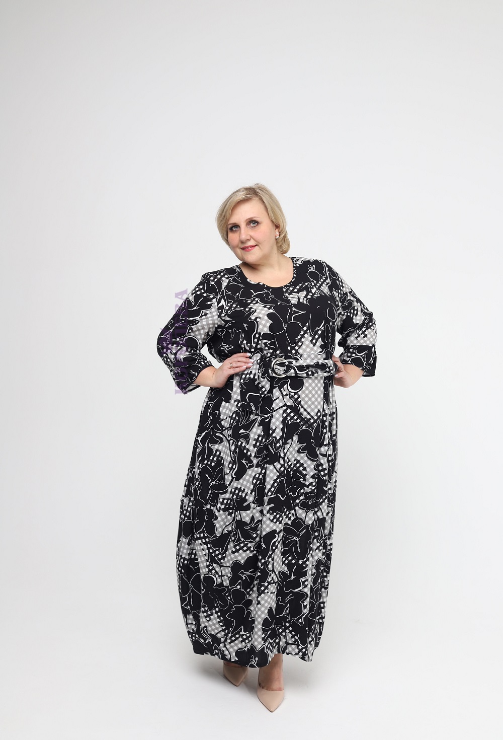 Клетчатое платье с черными цветами до пят, с круглым вырезом
