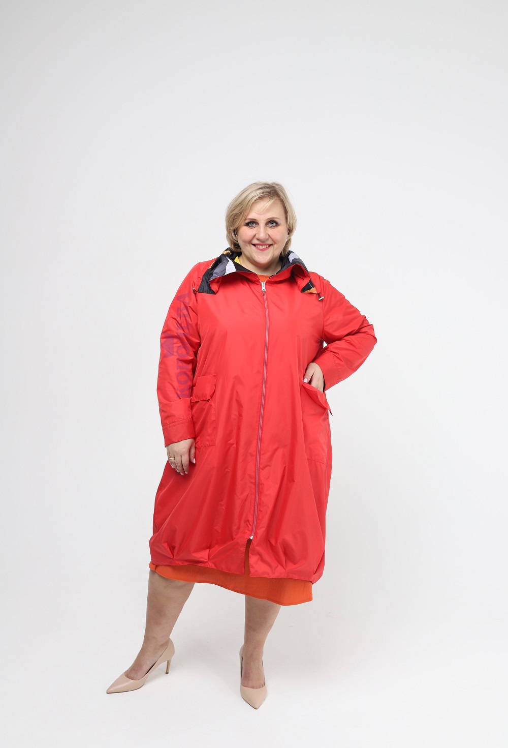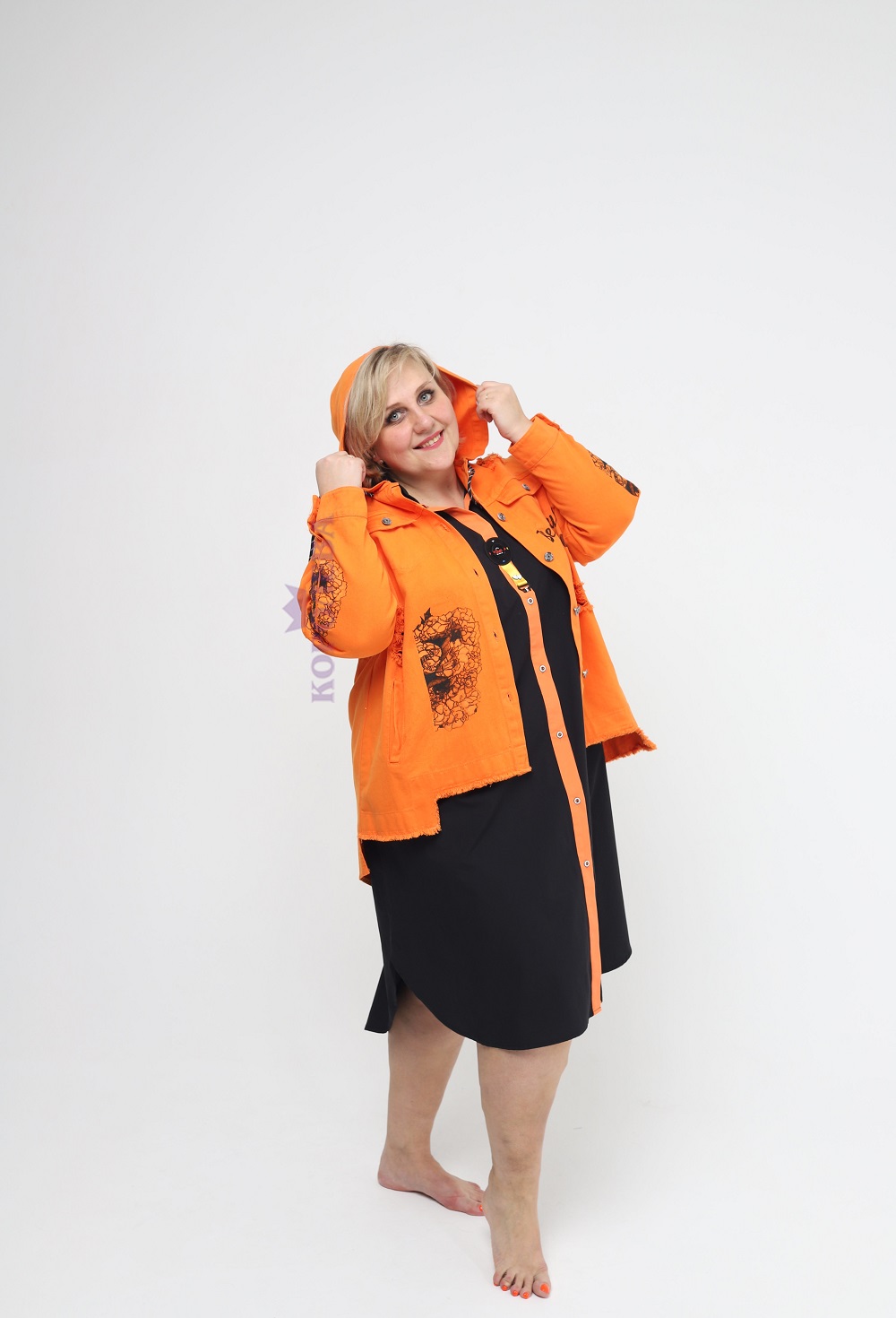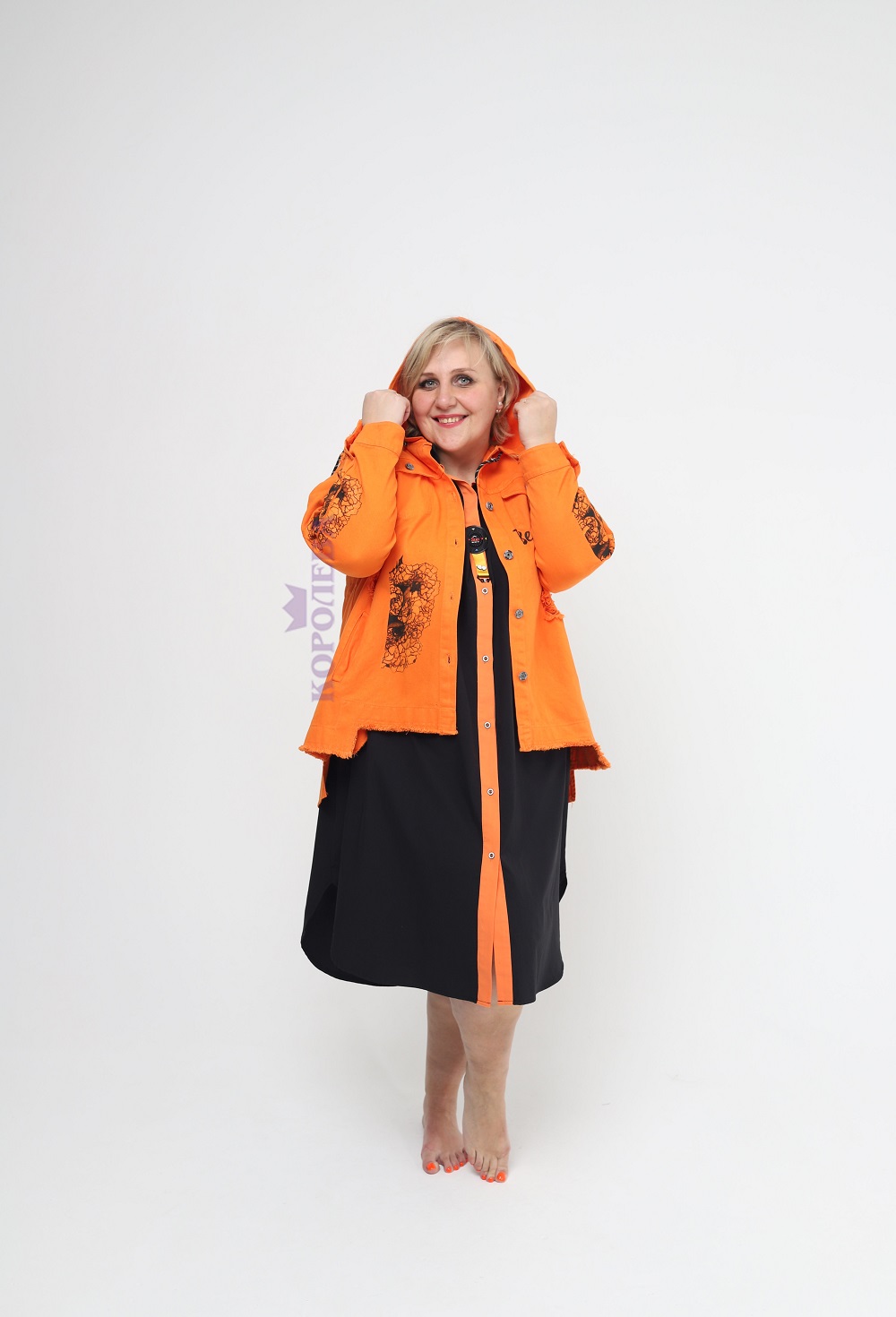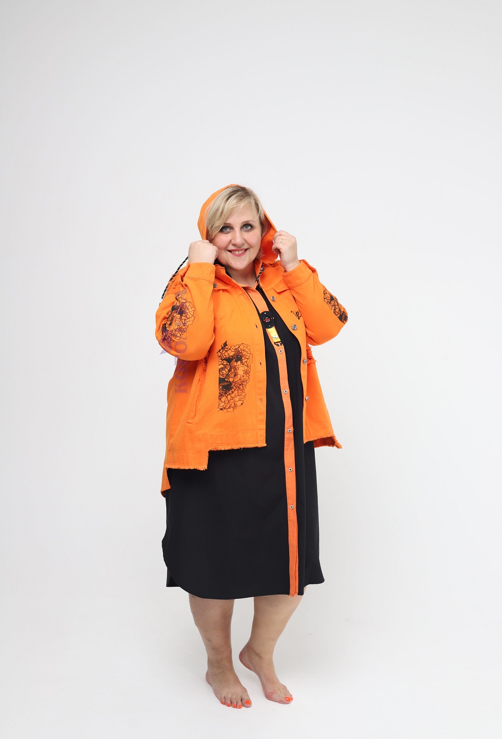 Оранжевая куртка на пуговицах с черными узорами и капюшоном