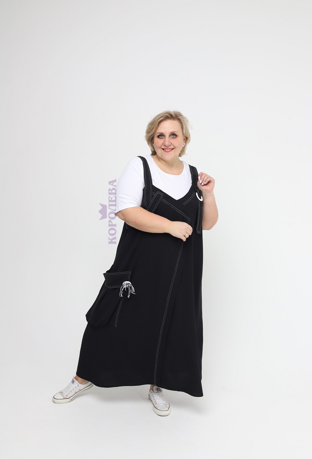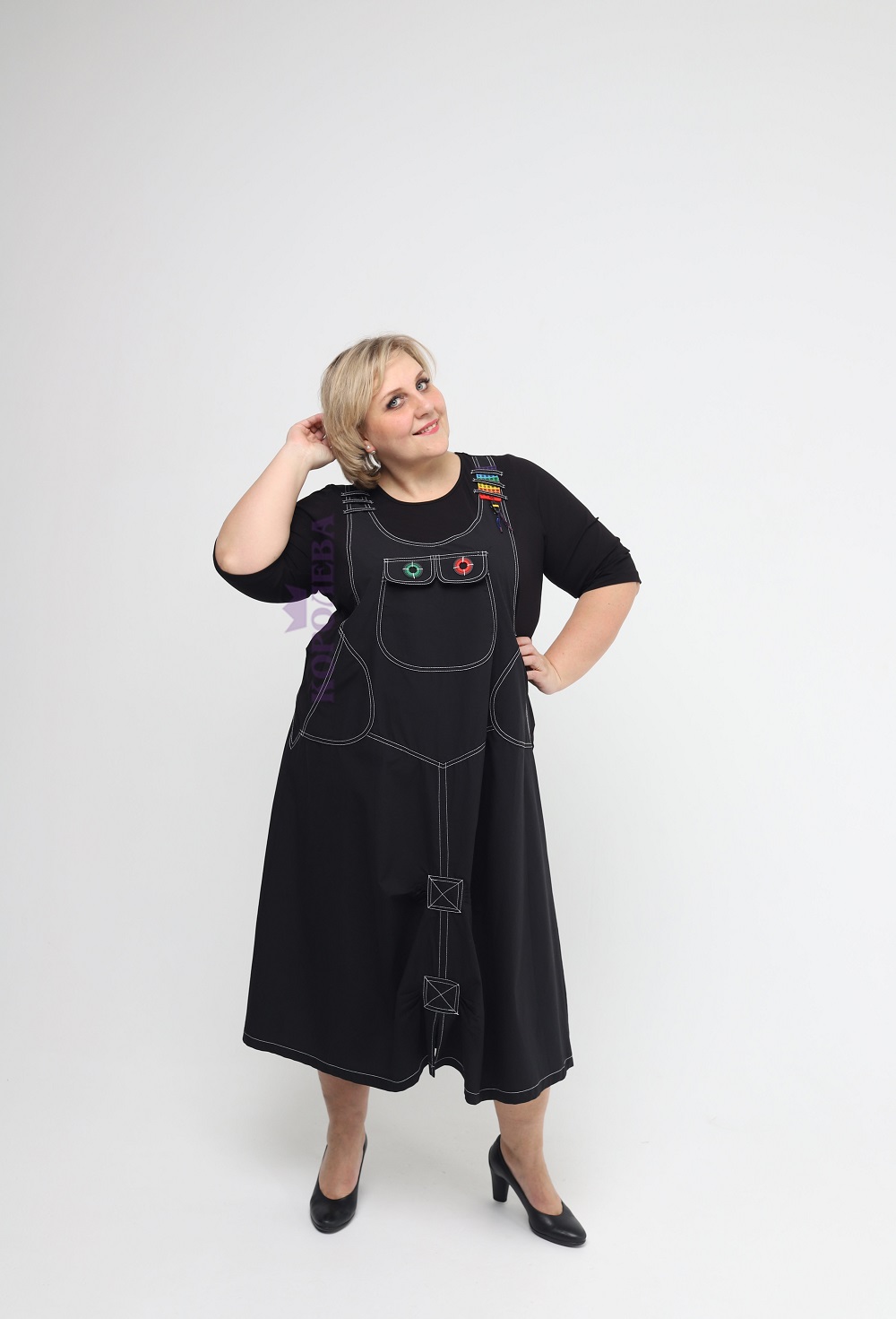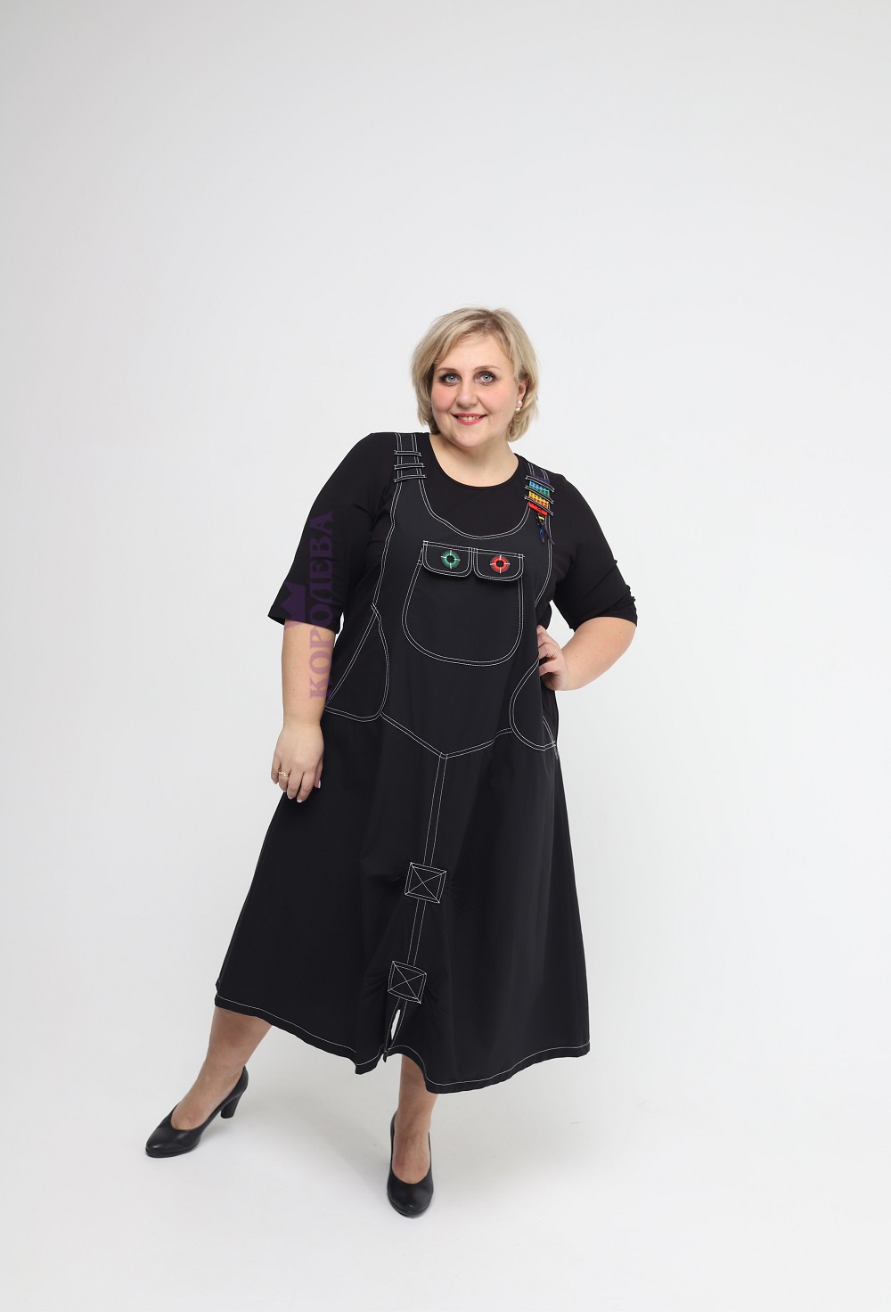 Длинное черное платье с оригинальным дизайном под сарафан и круглым вырезом