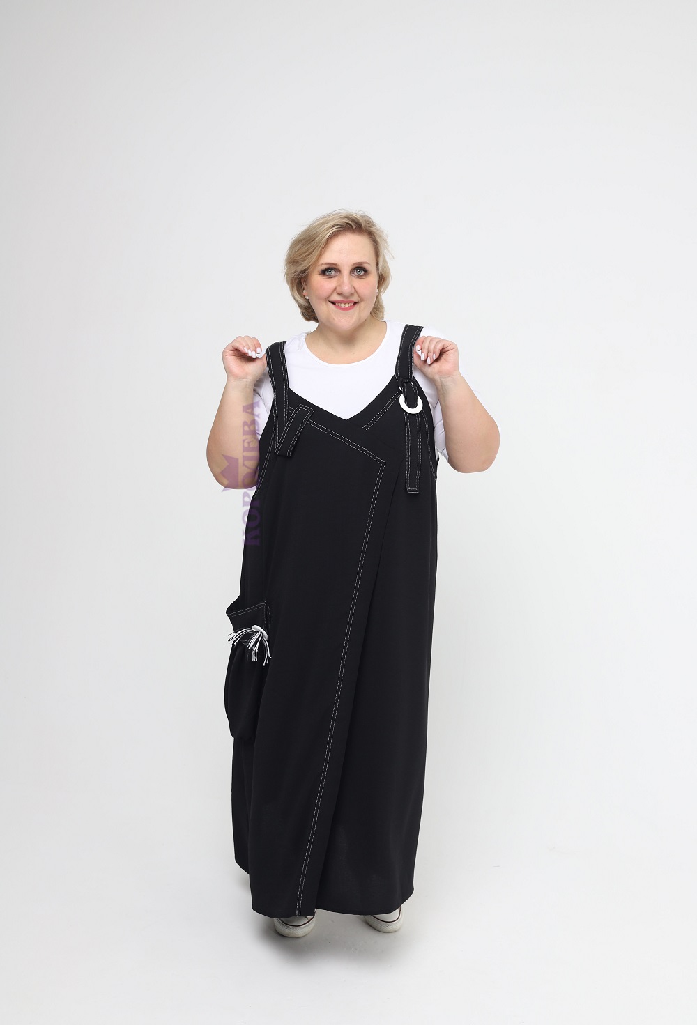 Стильный длинный свободный черный сарафан с большим карманом