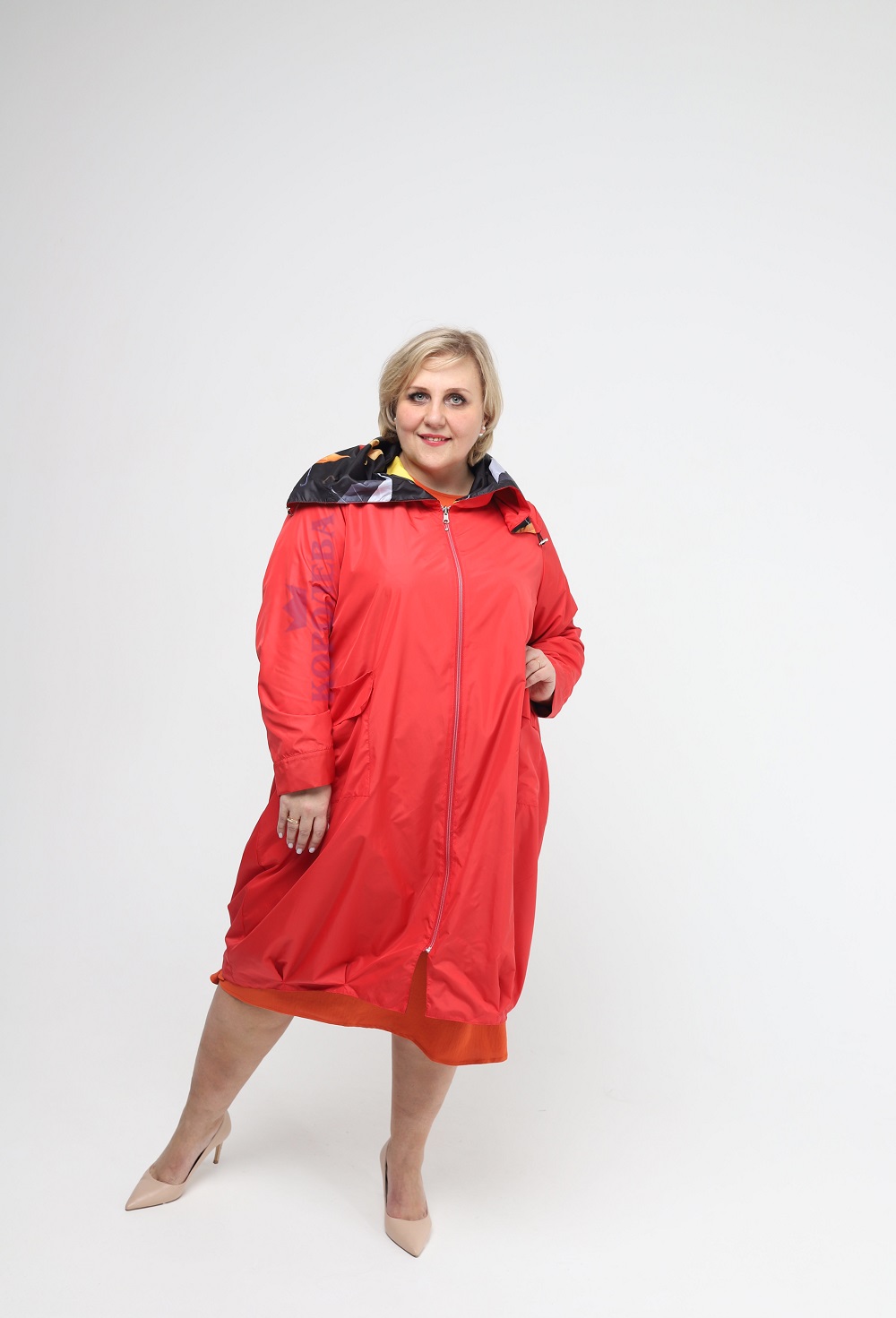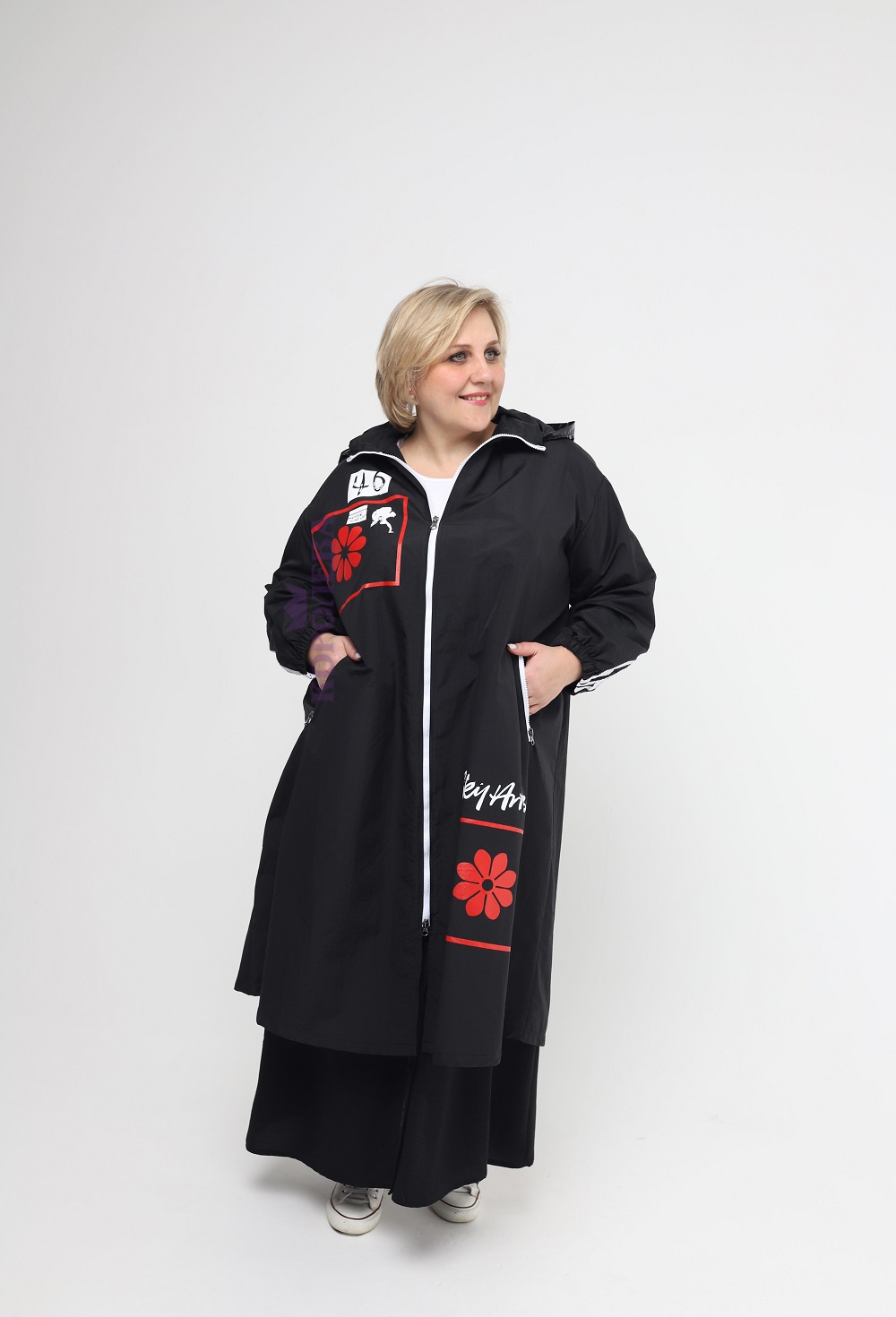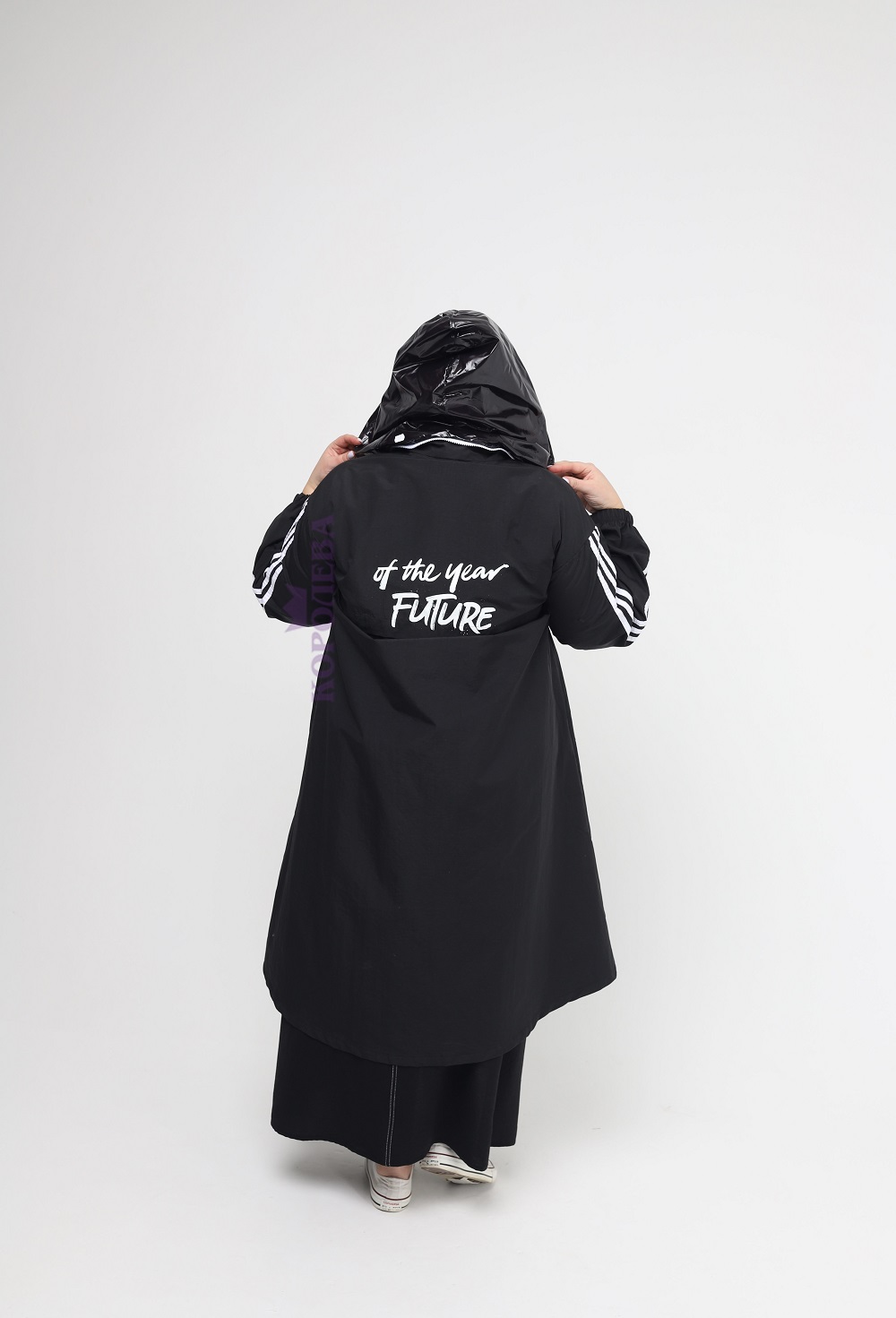 Стильный плащ клеш на молнии с принтами и блестящим капюшоном