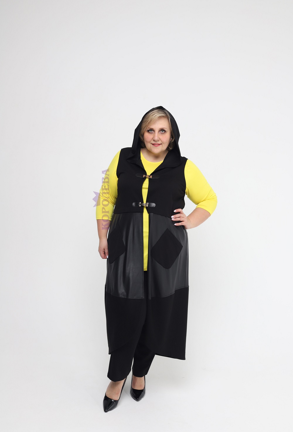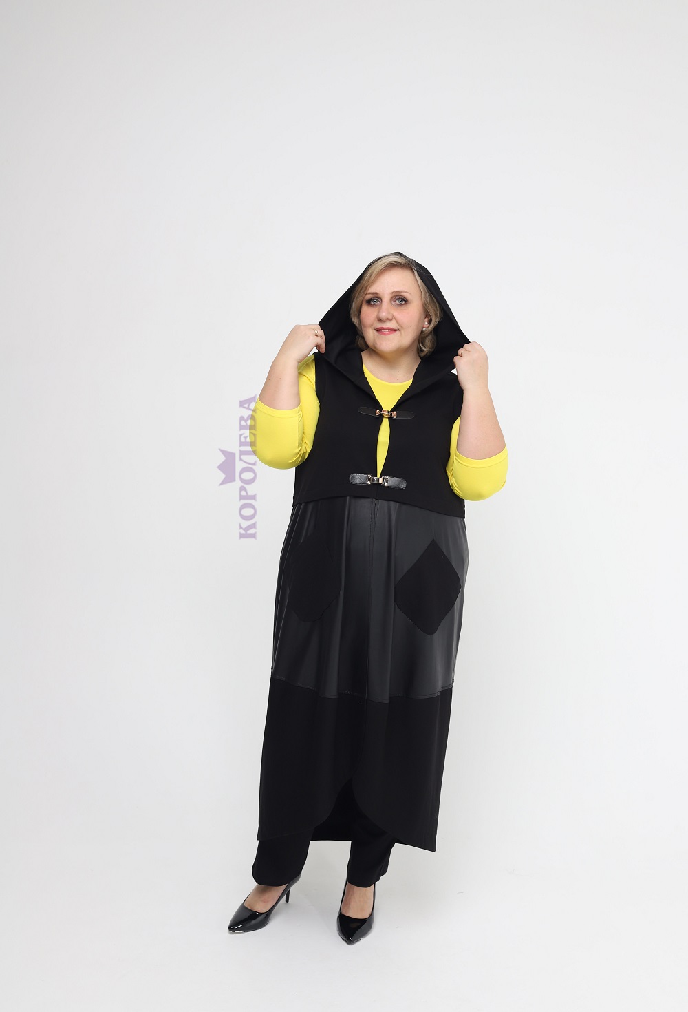 Элегантная черная накидка на застежках с капюшоном без рукавов