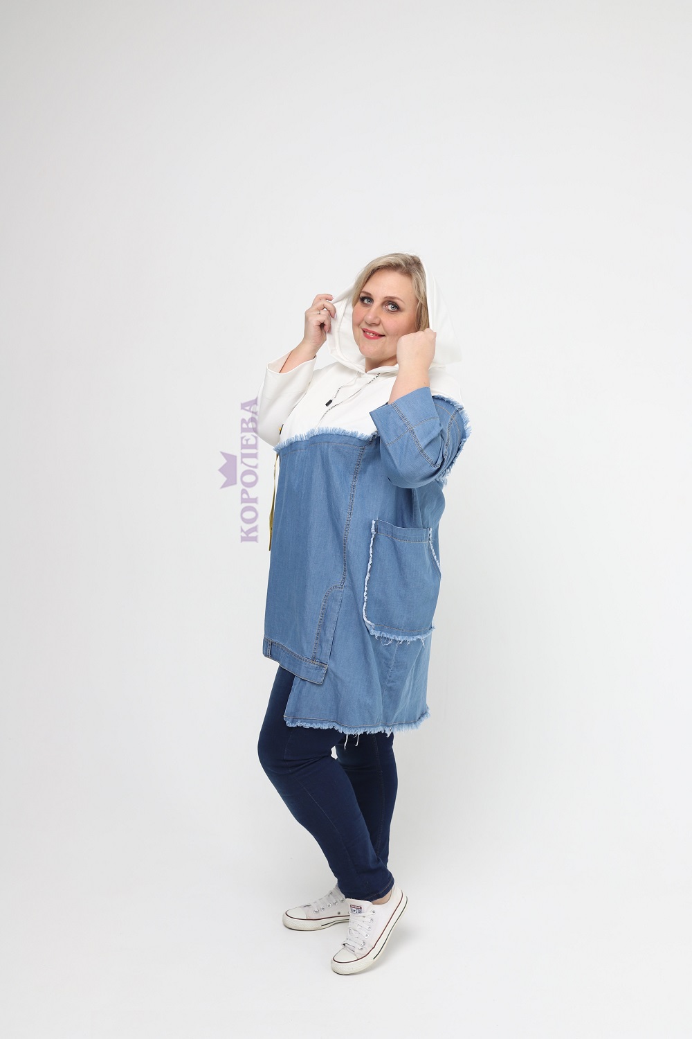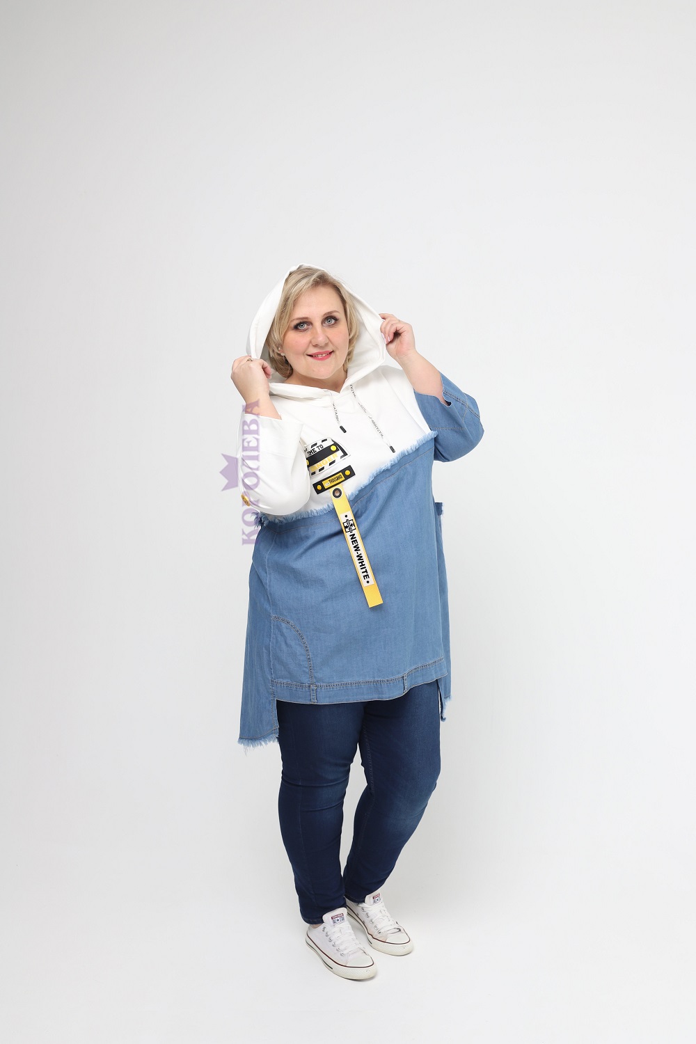 Стильная белая толстовка с вставкой из денима, капюшоном и яркой нашивкой