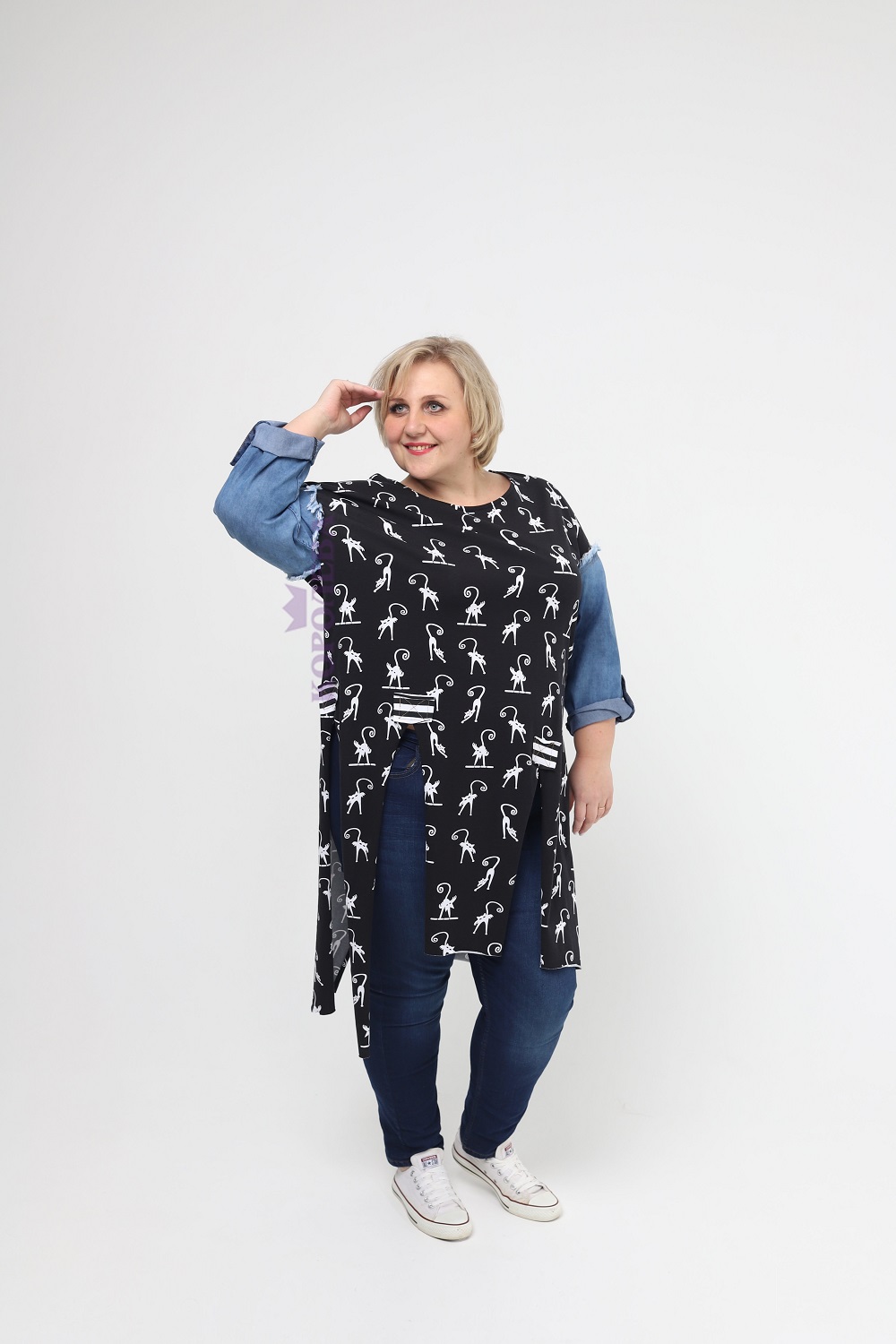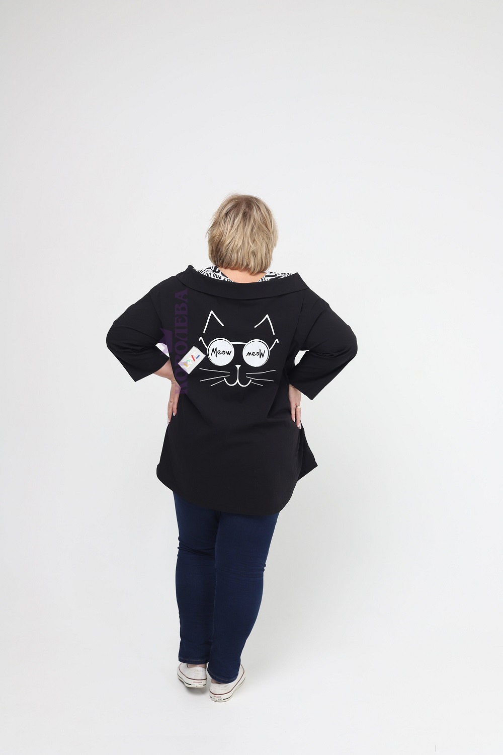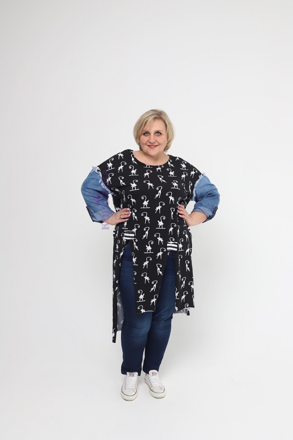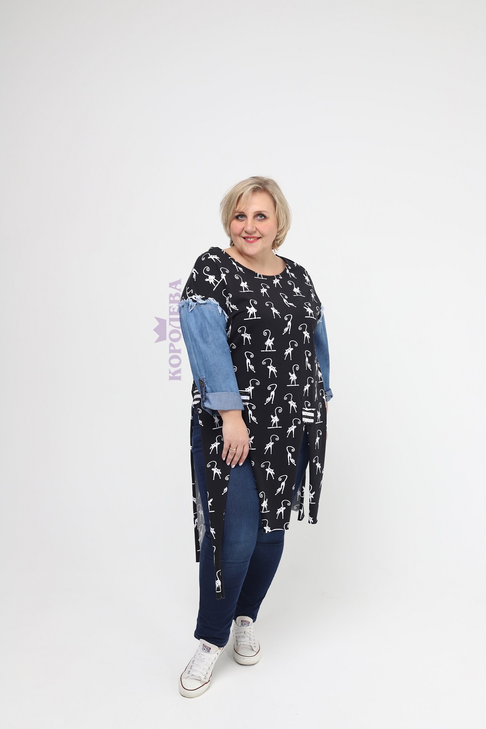 Изысканная черная туника с изображением котиков и рукавами из джинса