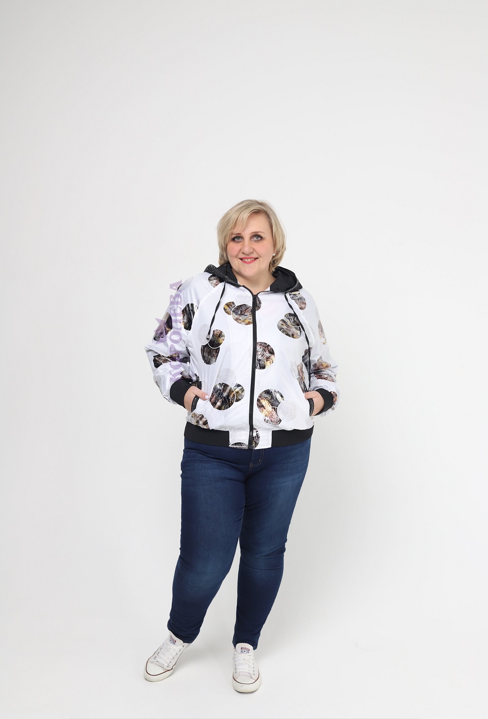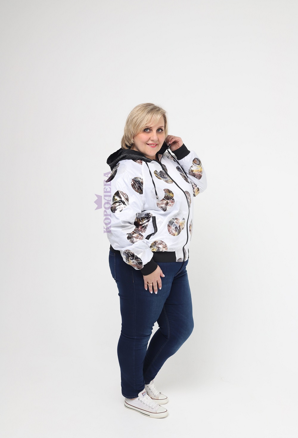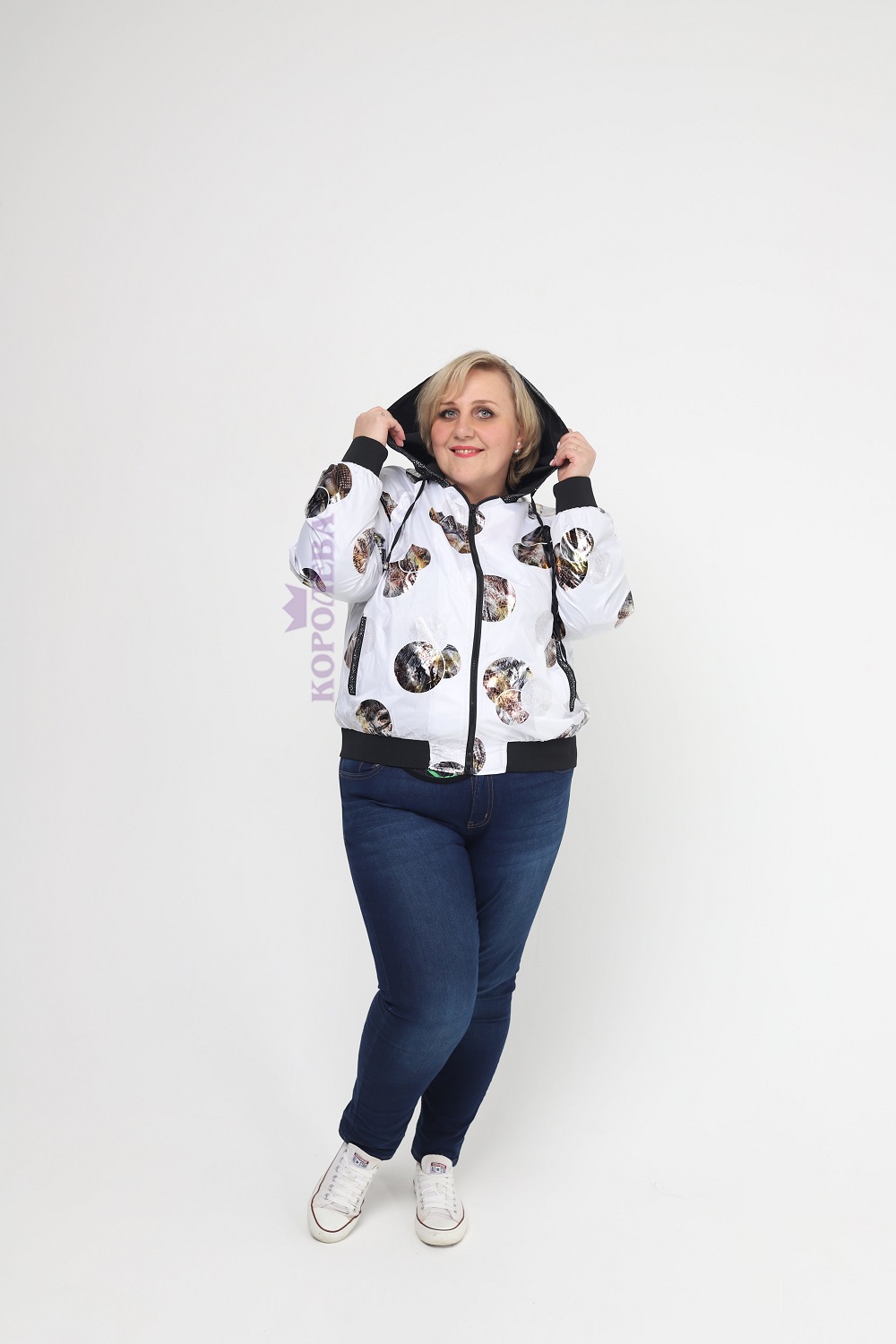 Стильная белая куртка с интересными узорами и капюшоном