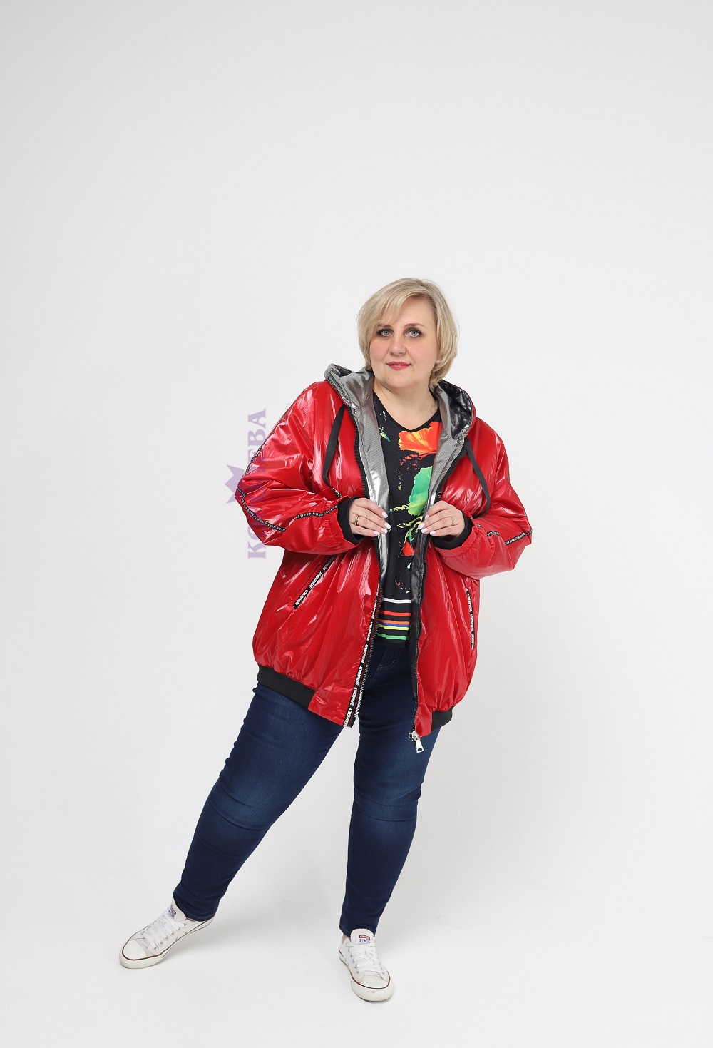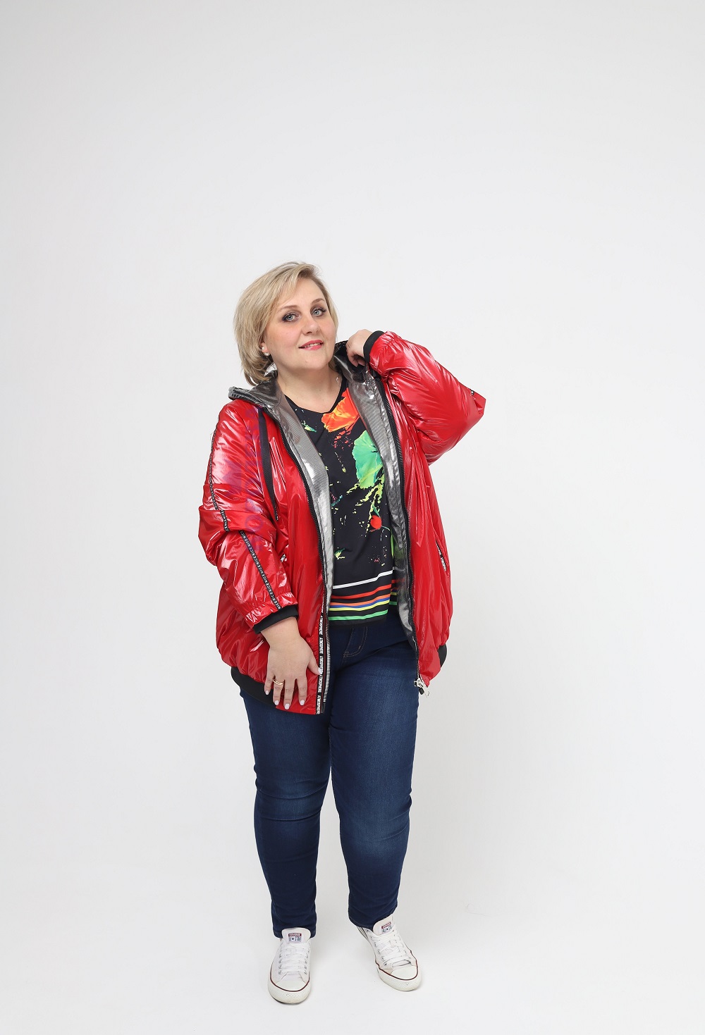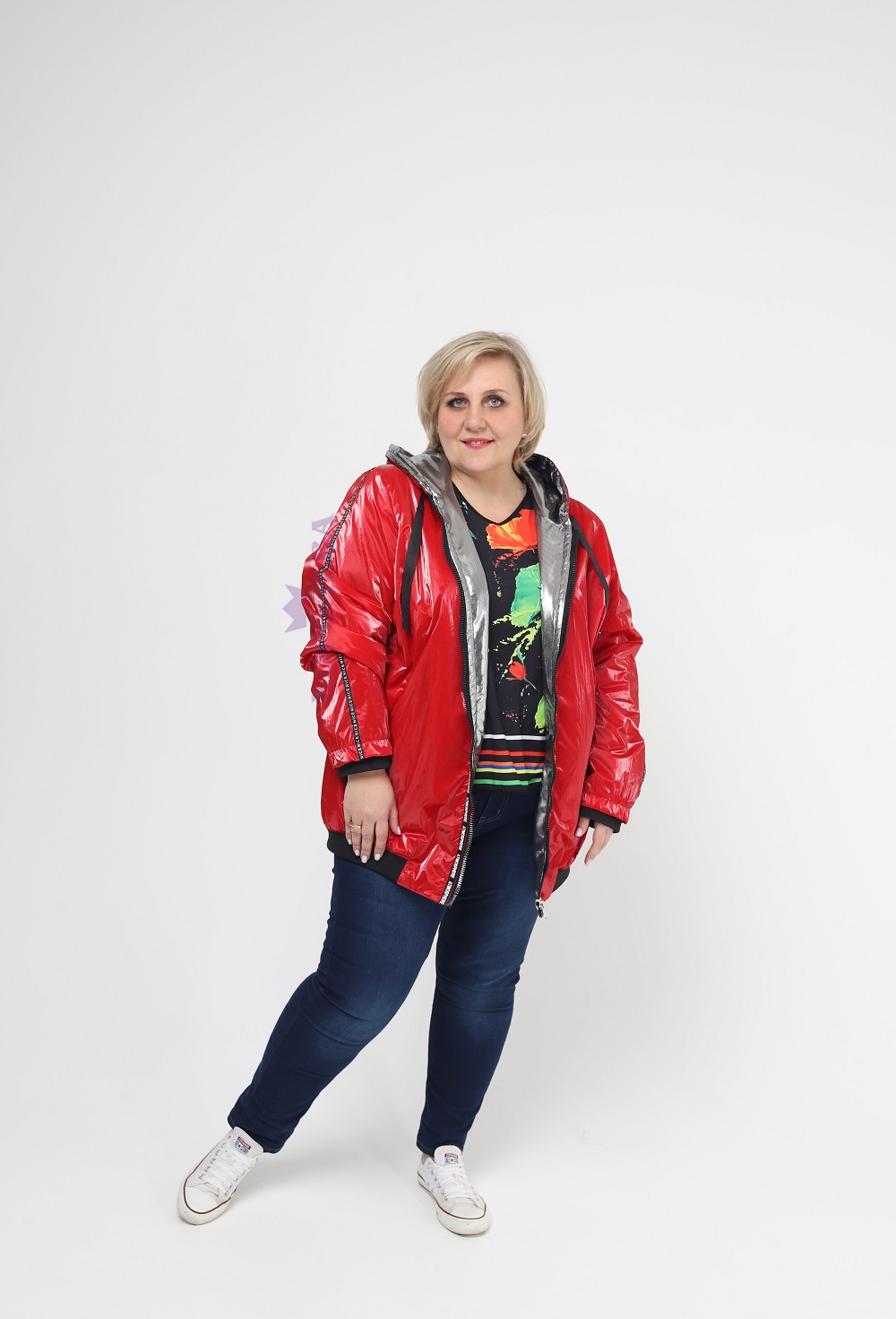Красная блестящая куртка с подкладкой цвета металлик на молнии