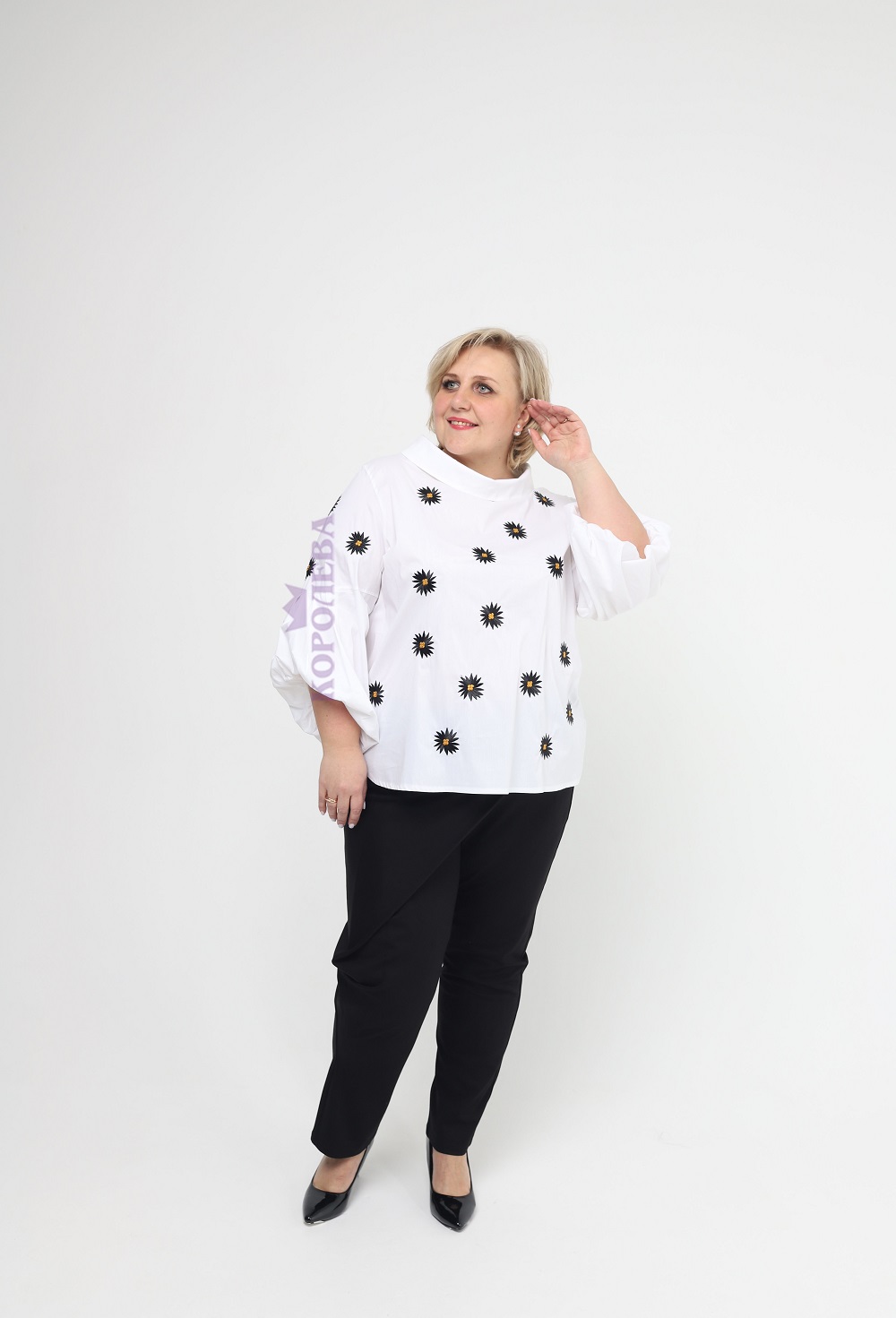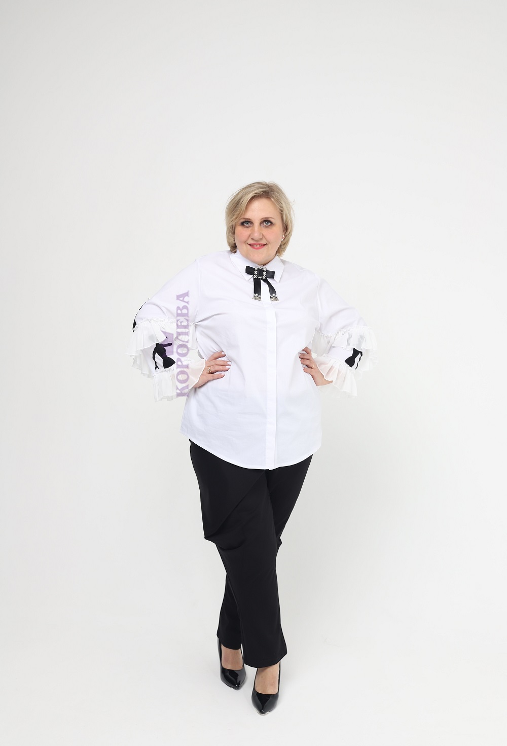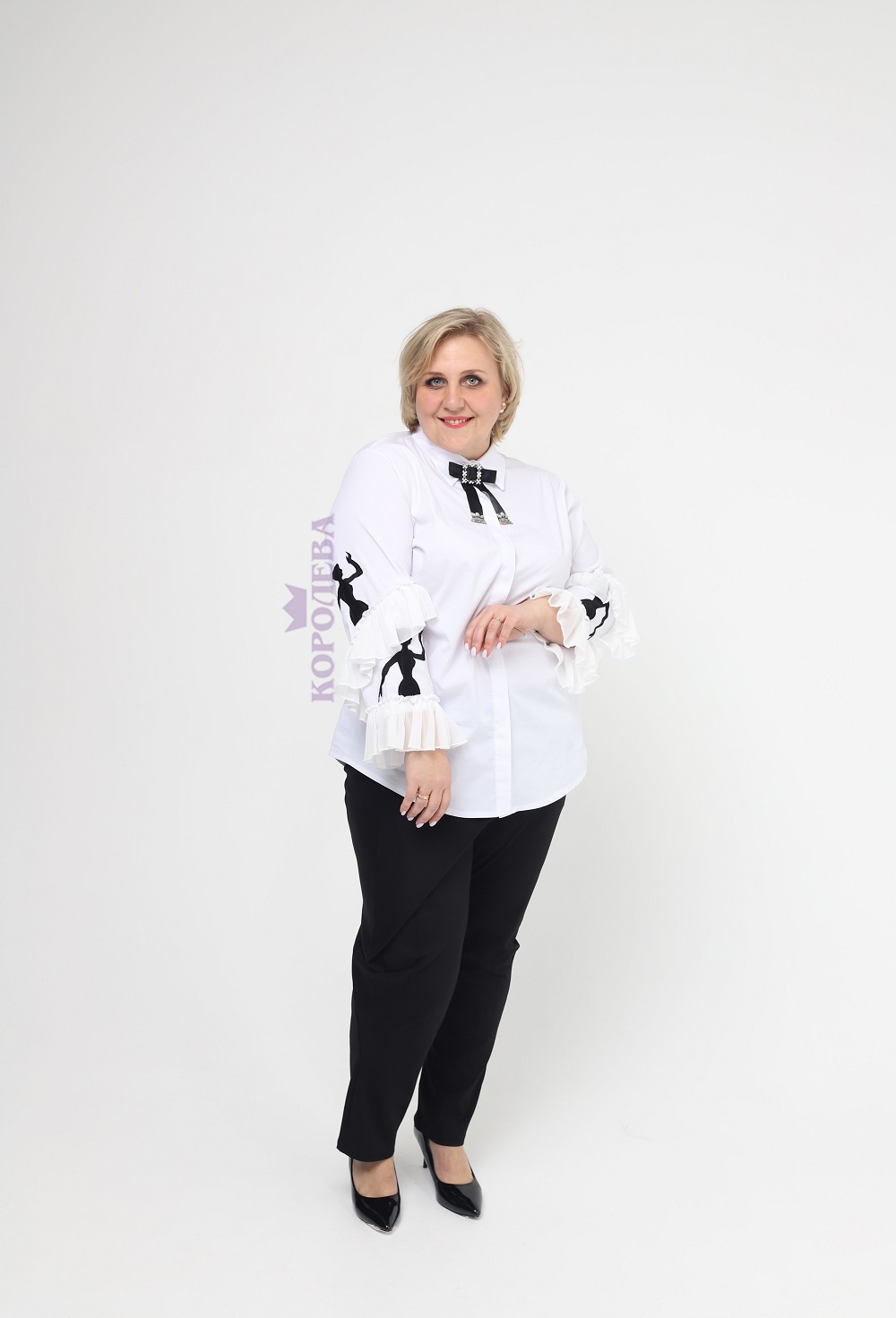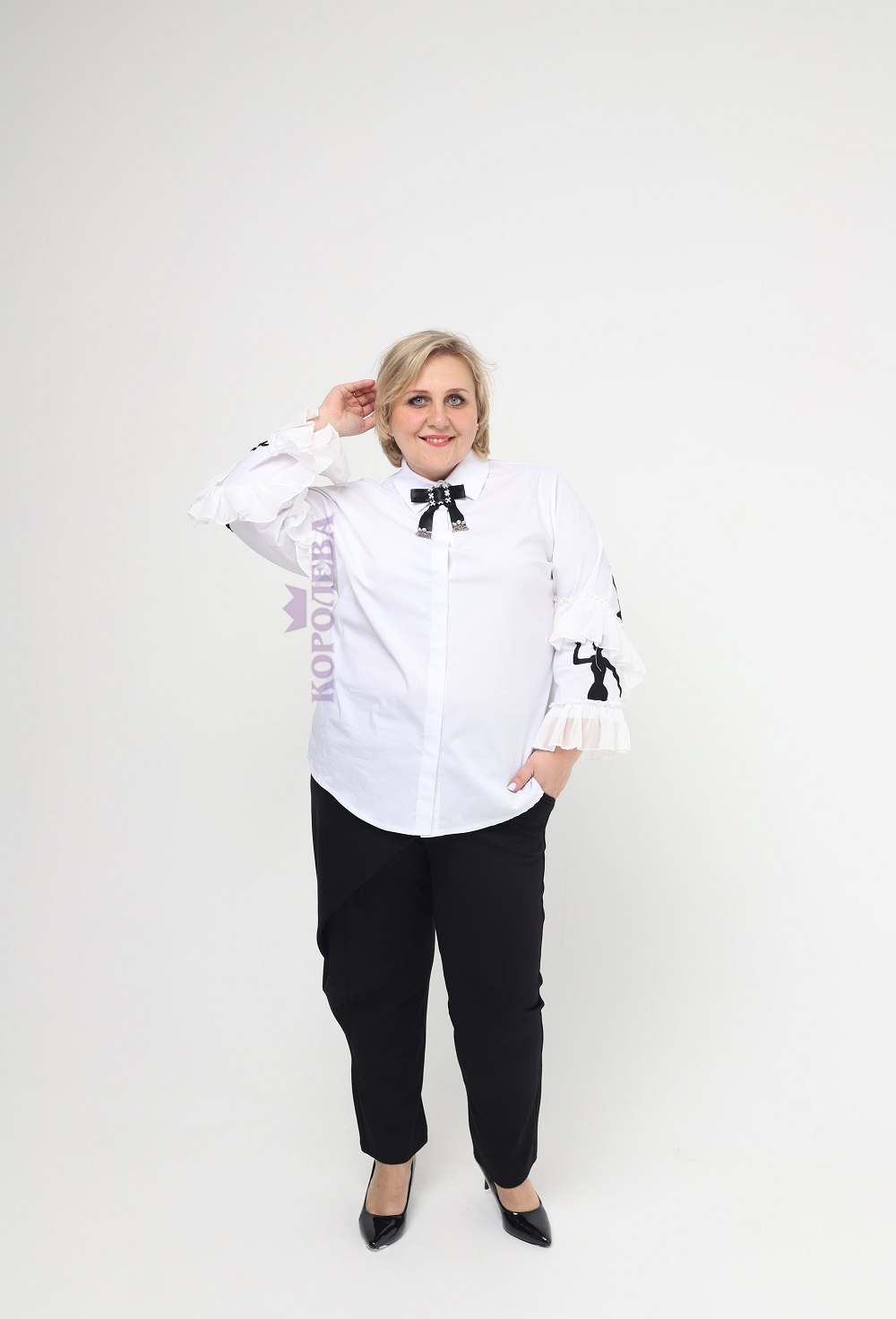 Элегантная белая блузка с воротничком, бабочкой и принтом на рукавах