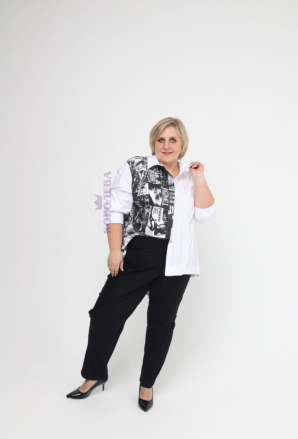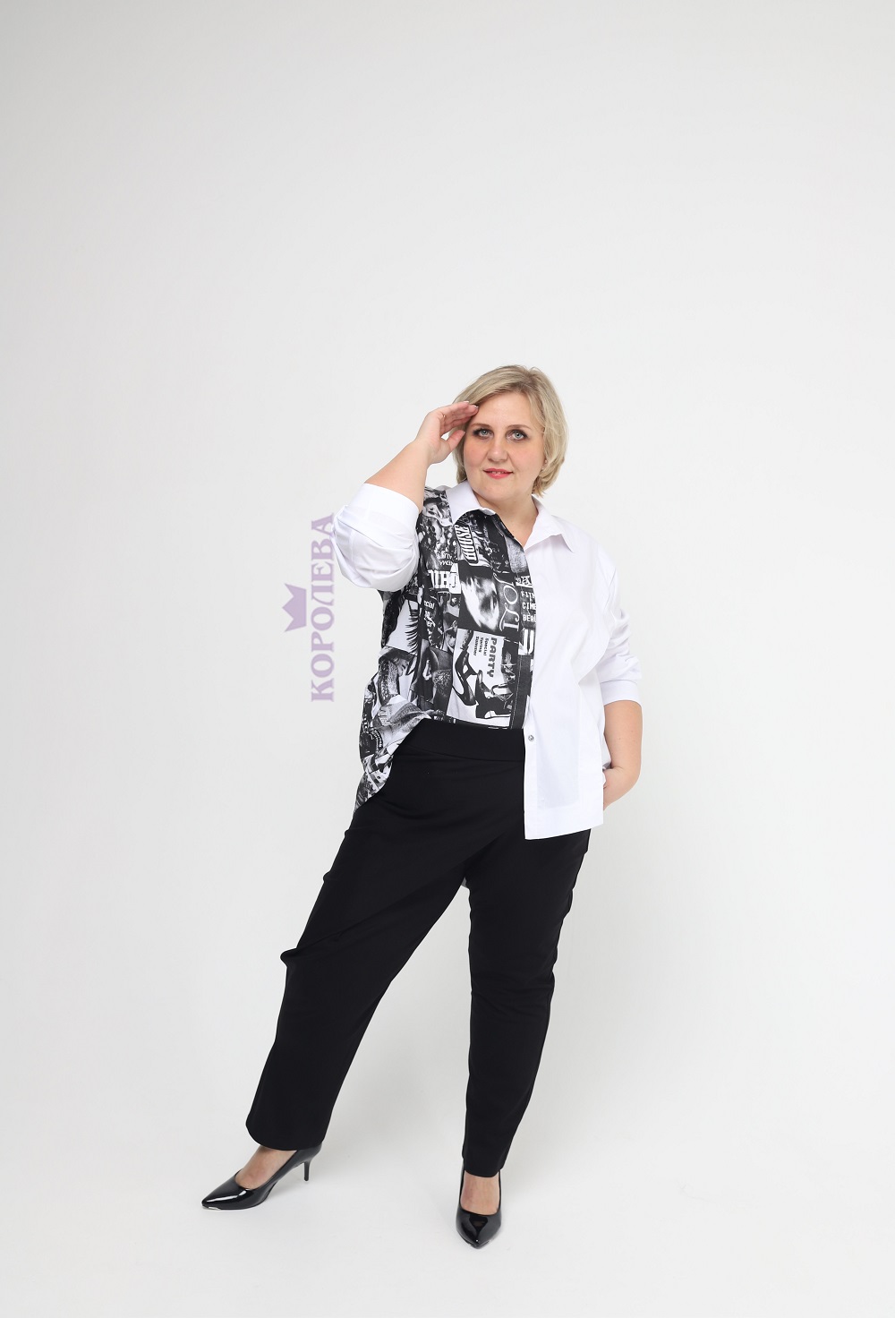 Белая рубашка с темным принтом и классическим воротником