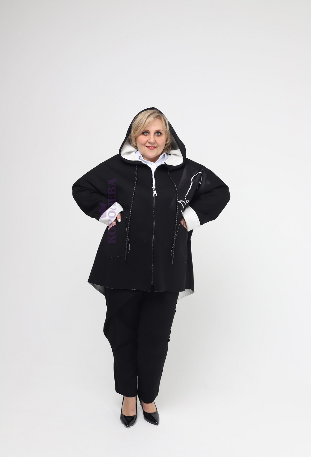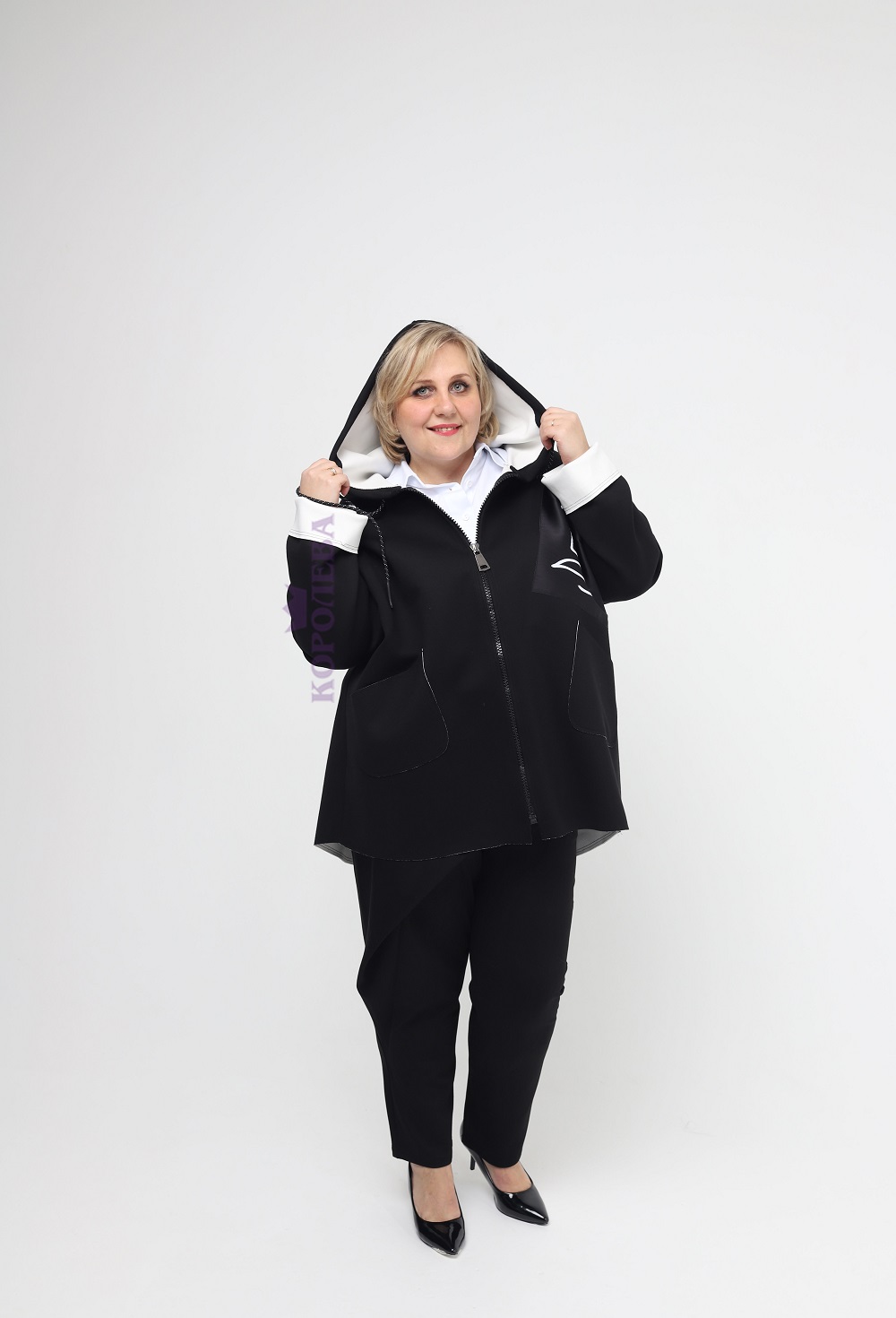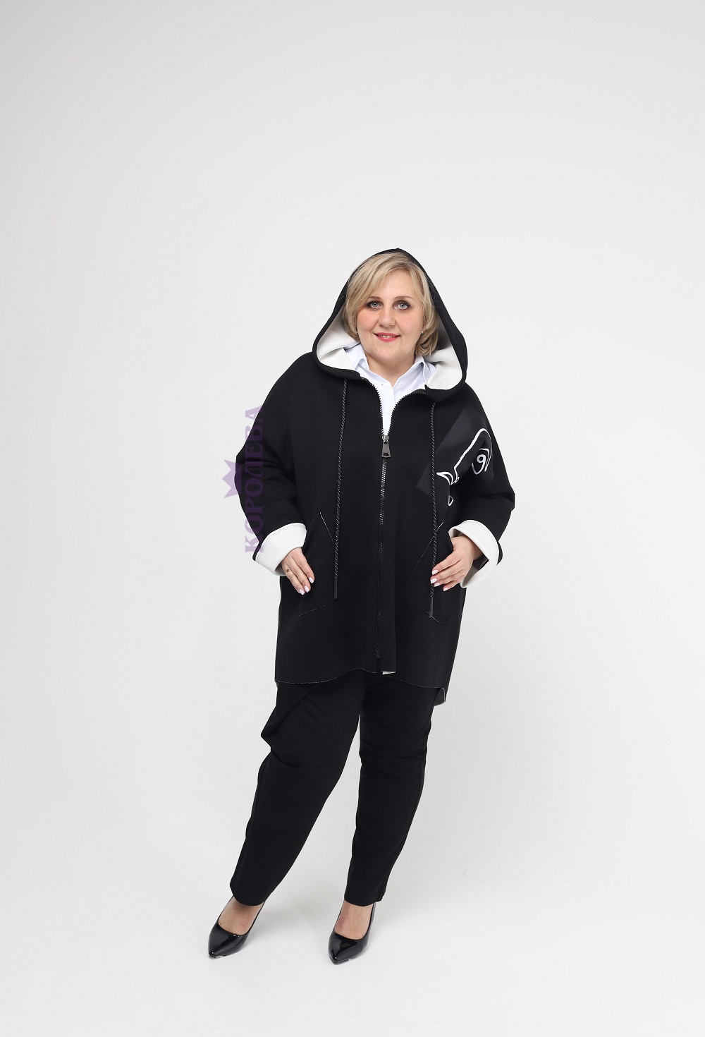Короткое черное пальто с белой подкладкой на молнии с капюшоном и вставкой слева