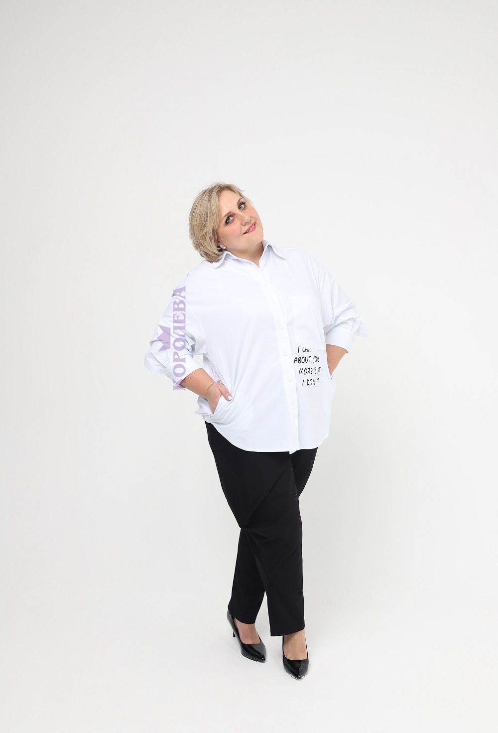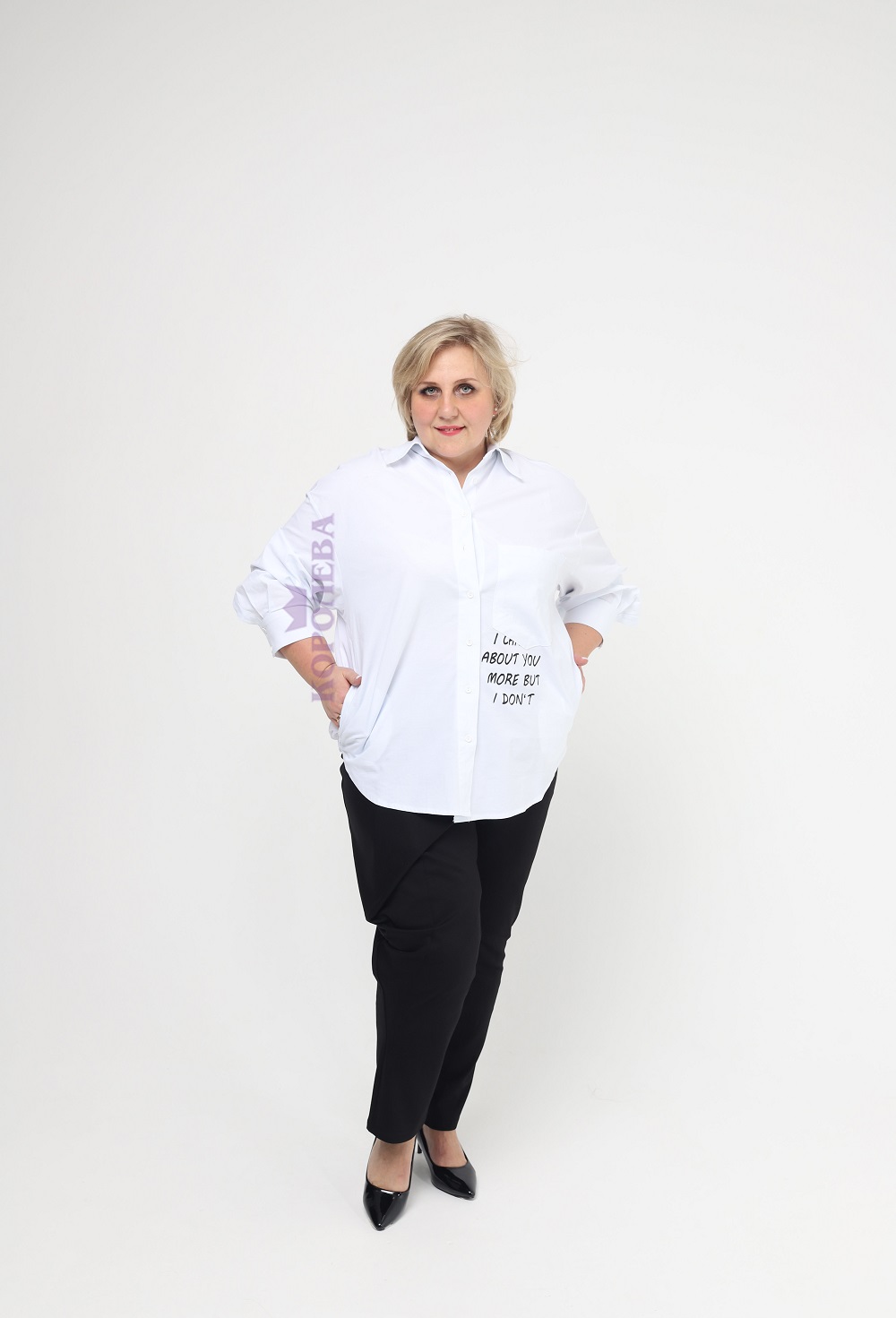 Стильная белая рубашка с надписью слева и классическим воротником