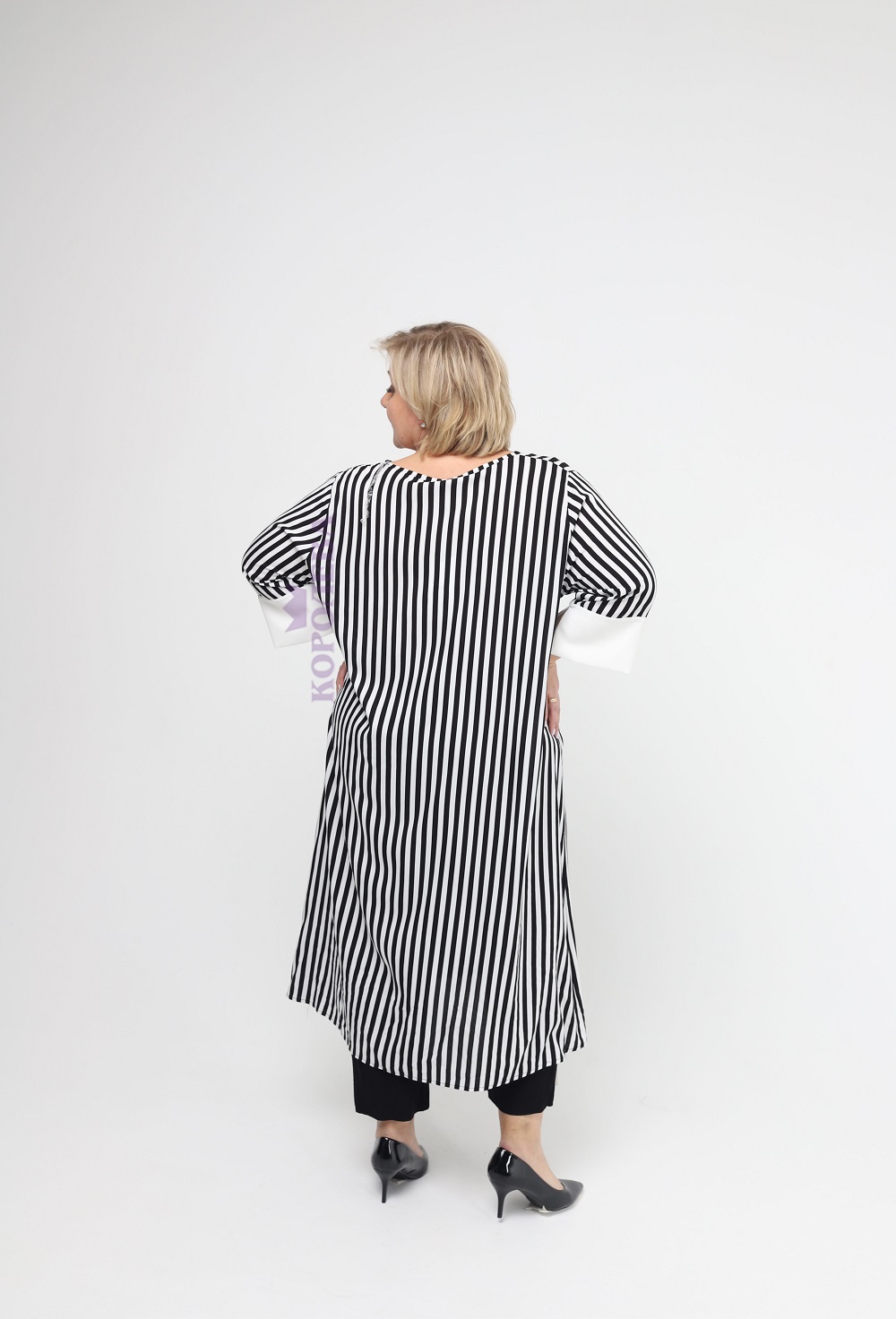 Стильная полосатая черно-белая туника с яркой нашивкой и белым воротником