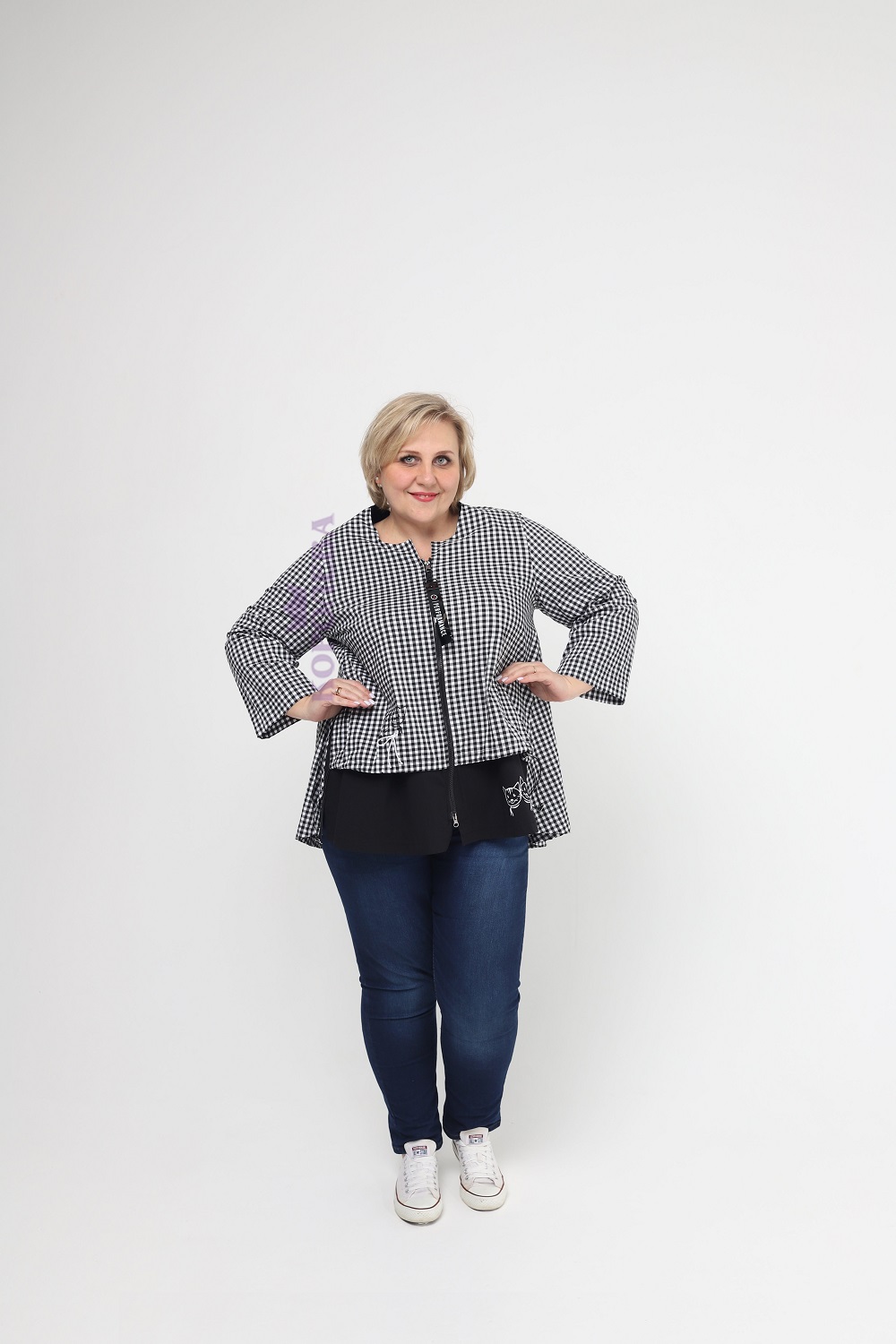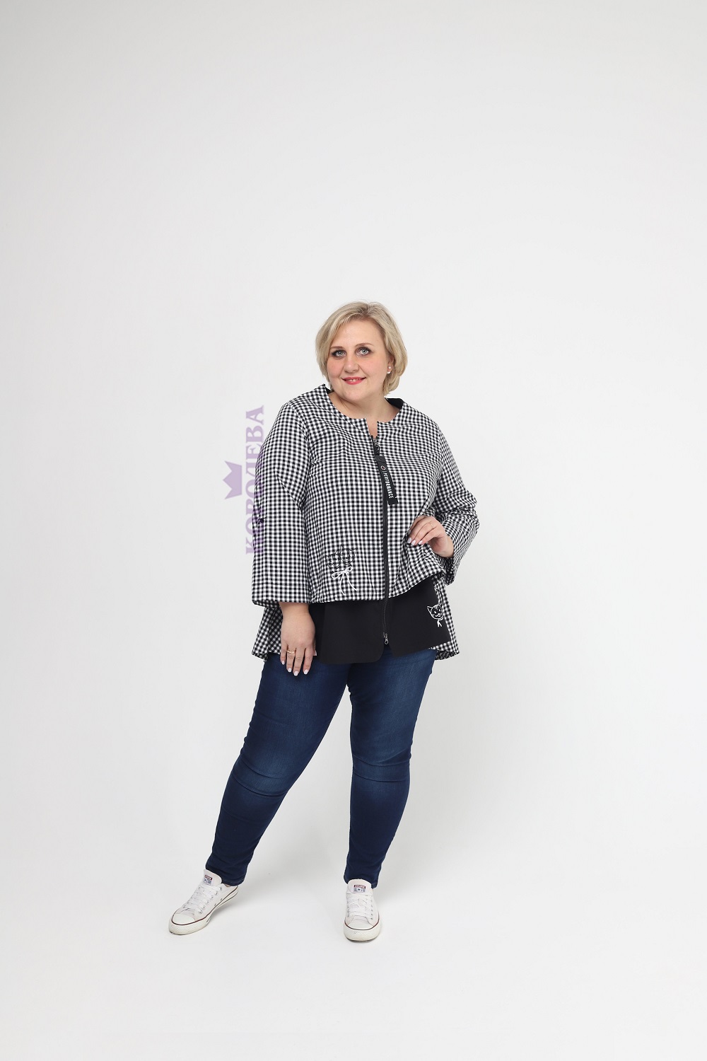 Клетчатая черно-белая блуза на молнии с классическим воротником и поясом на талии