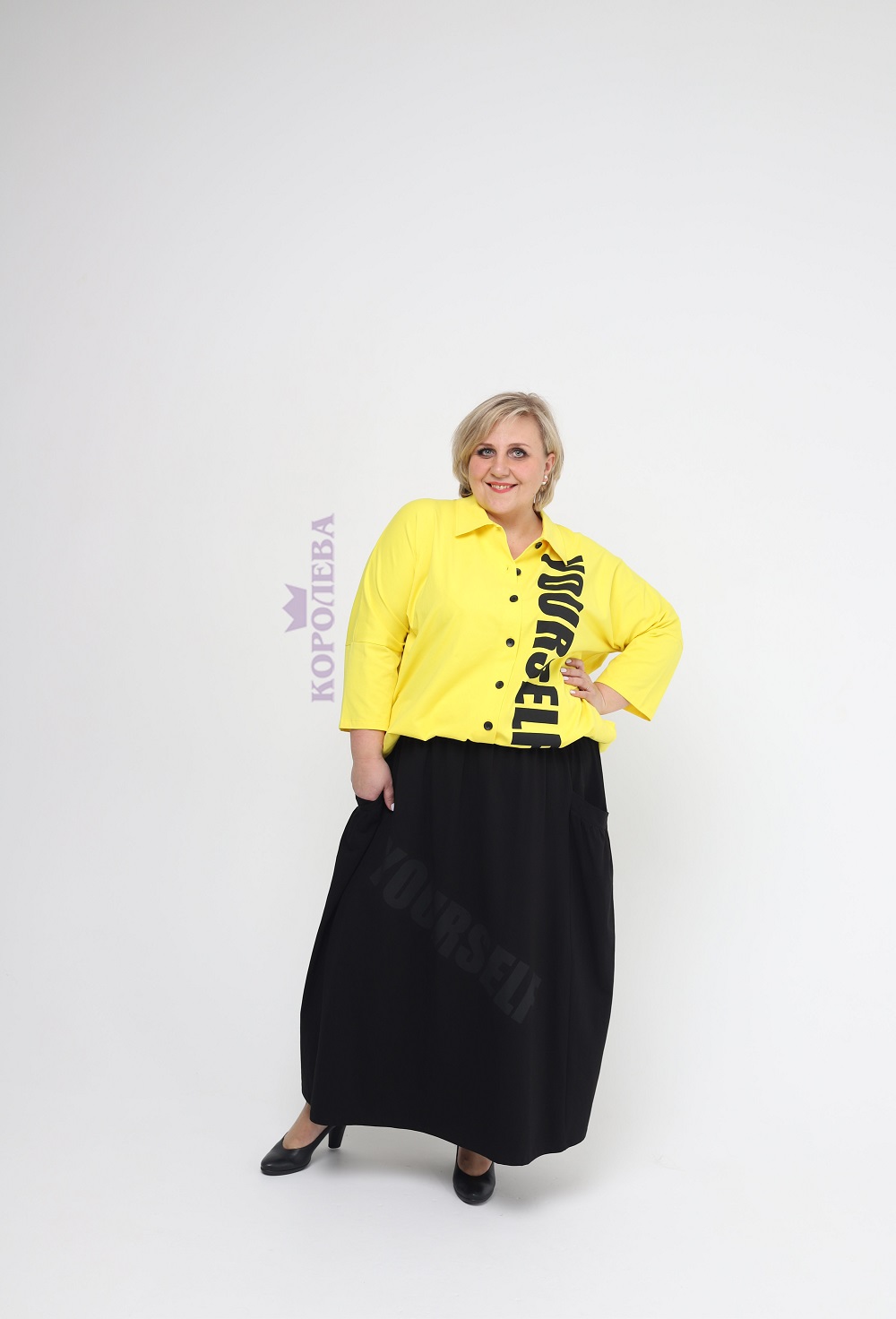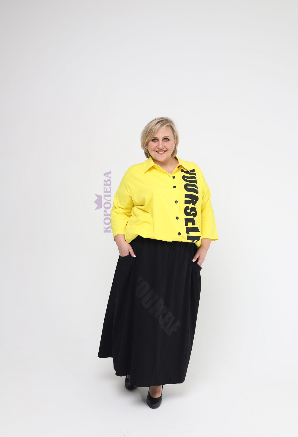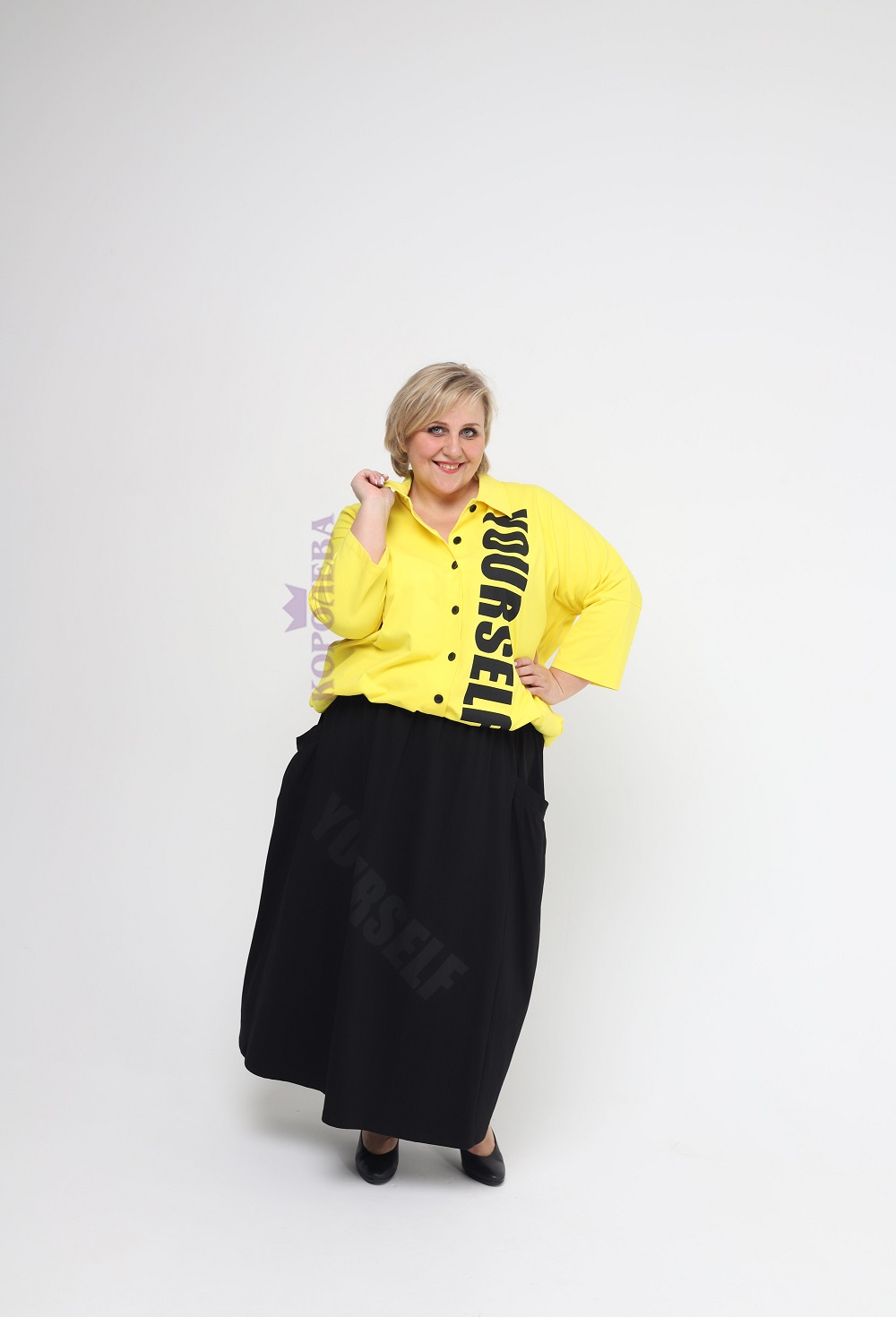 Стильная желтая блуза на заклепках с черной надписью и классическим воротником