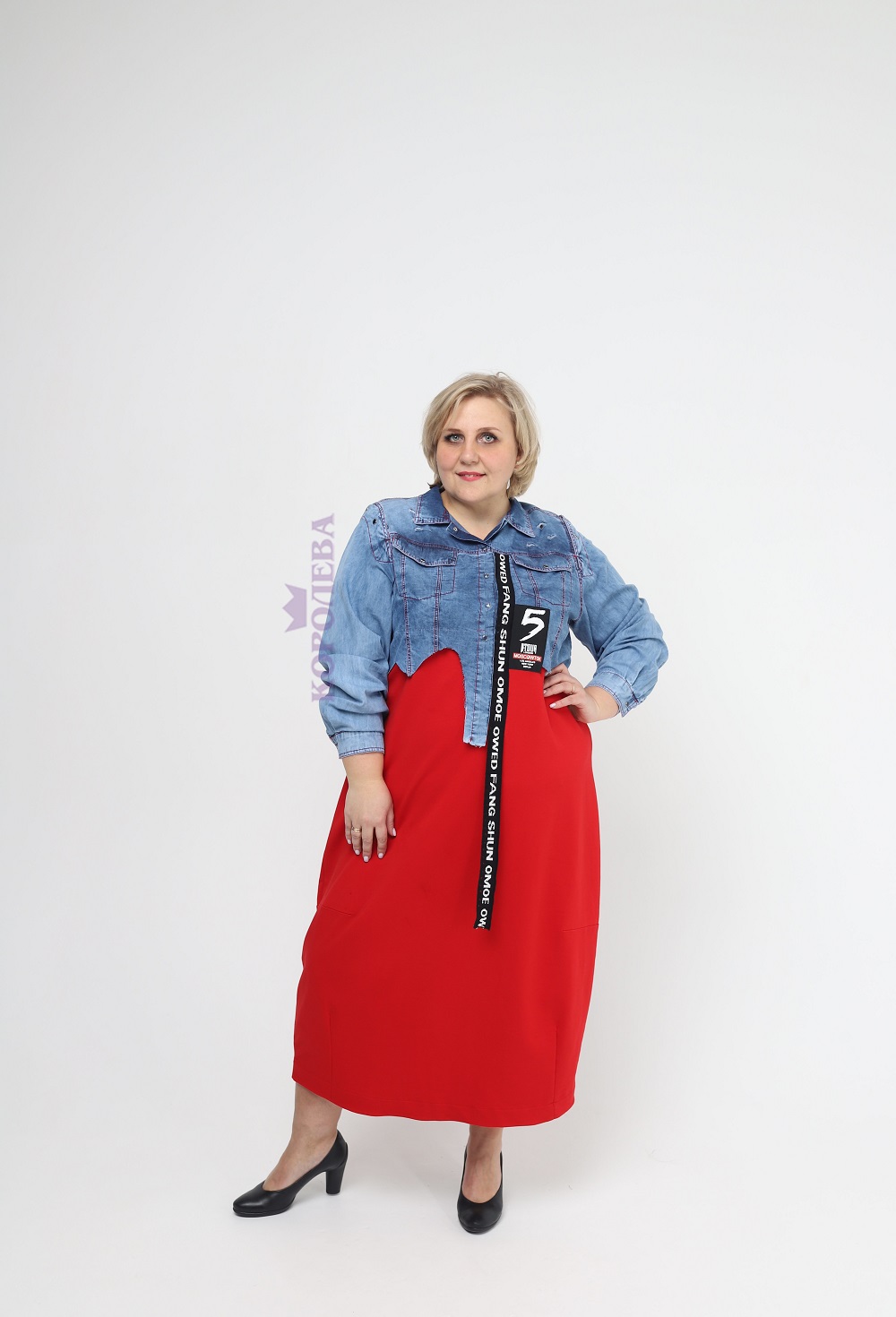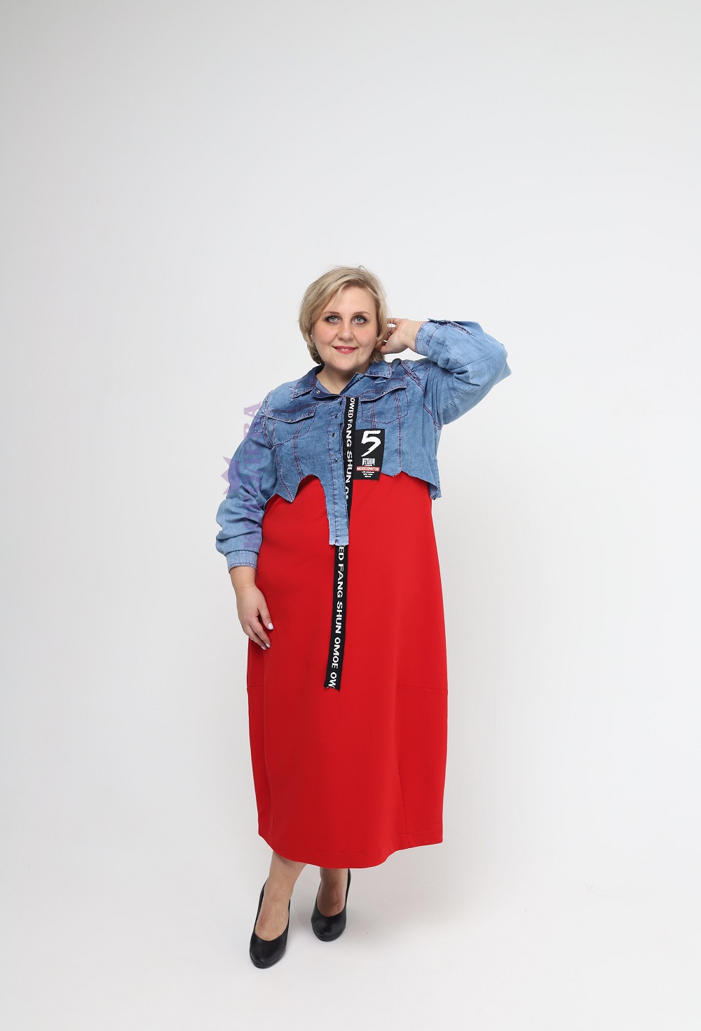 Длинное платье с красным низом и джинсовым верхом