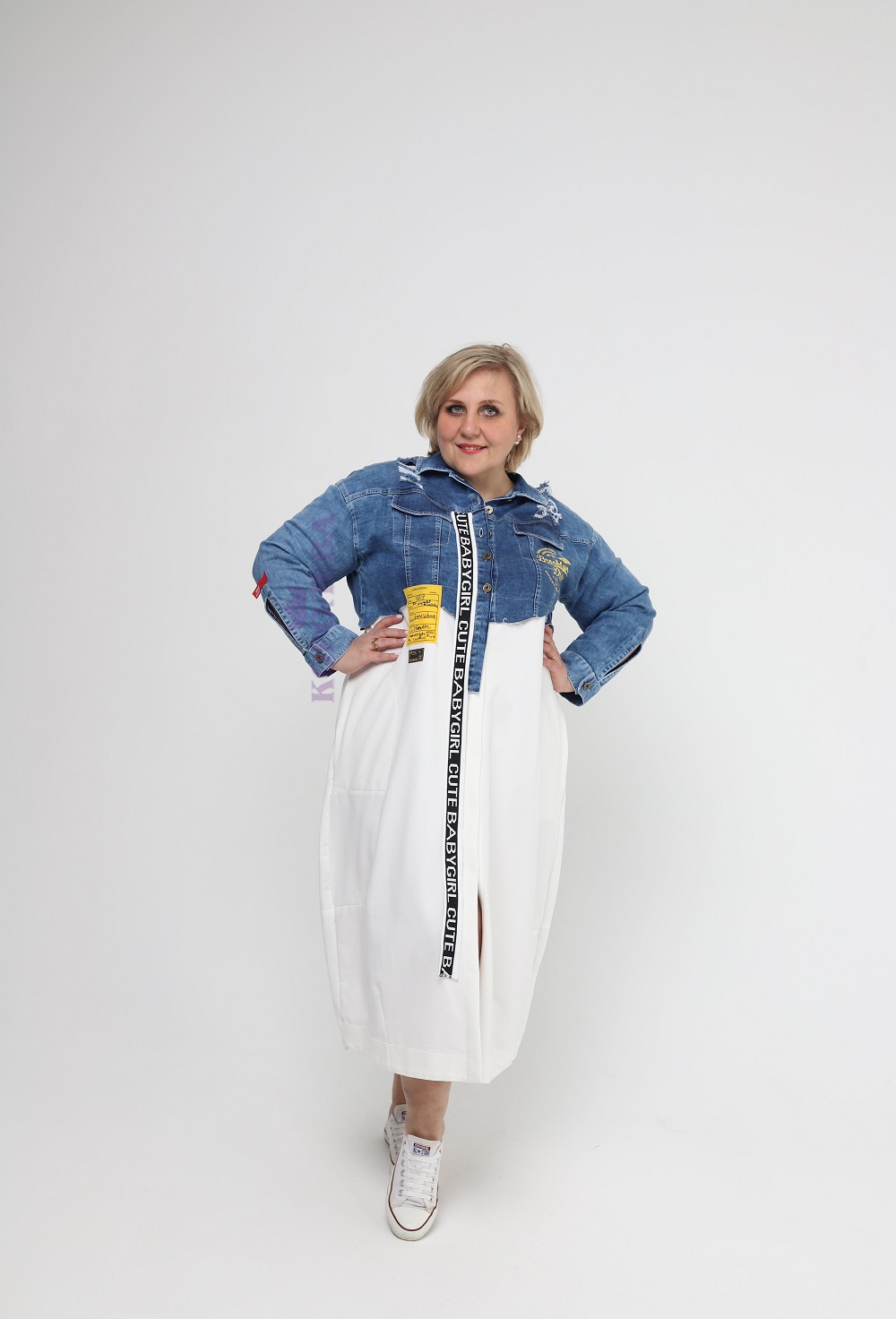 Стильное длинное платье с белым низом и джинсовым верхом с классическим воротником
