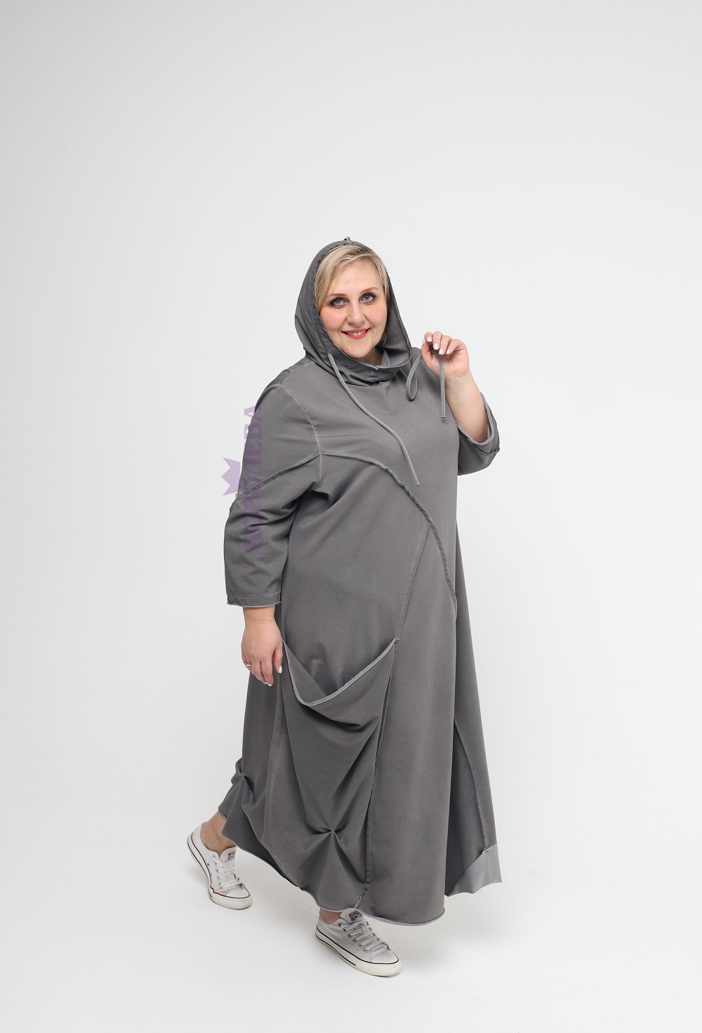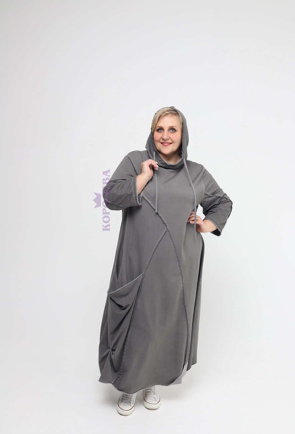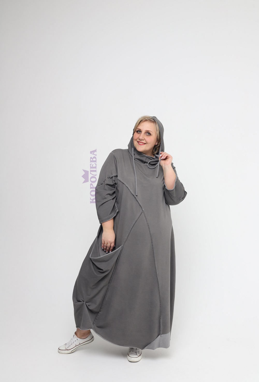 Серое платье-балахон Бохо до пят с капюшоном и высоким вырезом