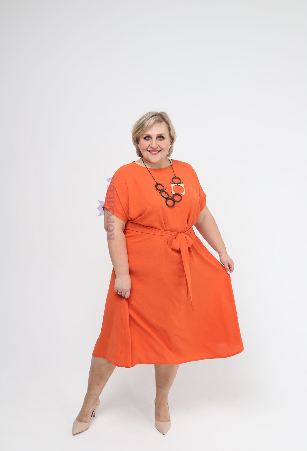 Стильное оранжевое платье клеш до колен с высоким вырезом и поясом на талии