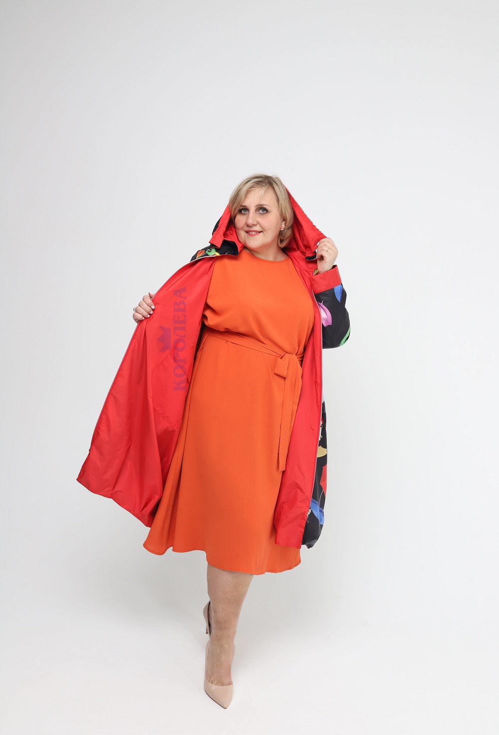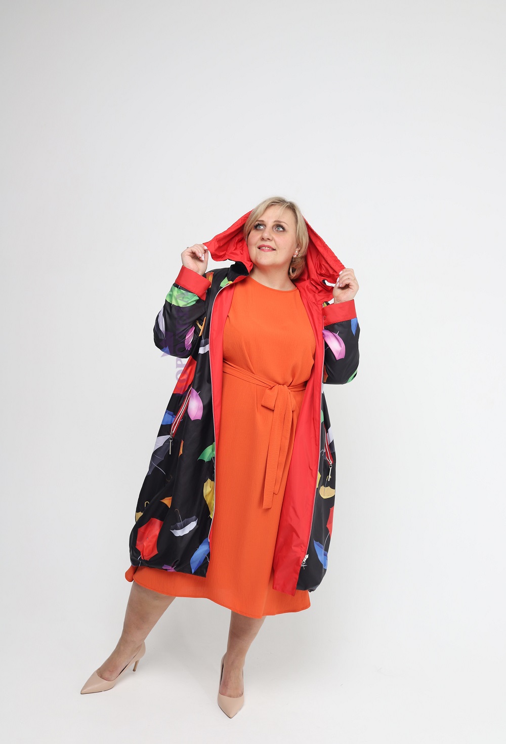 Двухсторонняя длинная куртка красного цвета с черной внутренней стороной с изображением зонтиков и капюшоном на молнии