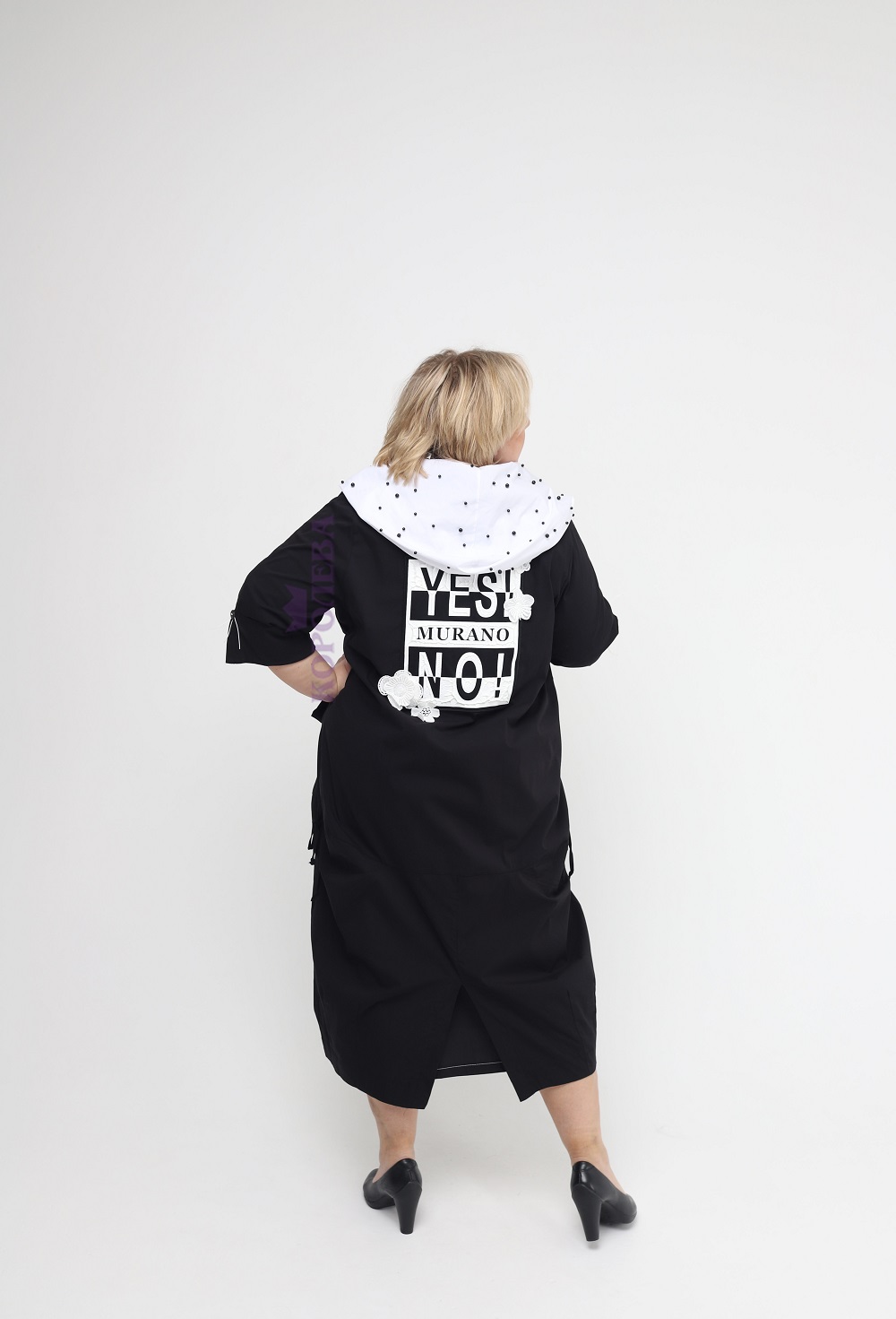 Трендовое черное пальто на пуговицах с белым капюшоном, украшенным бусинами и принтом на спине